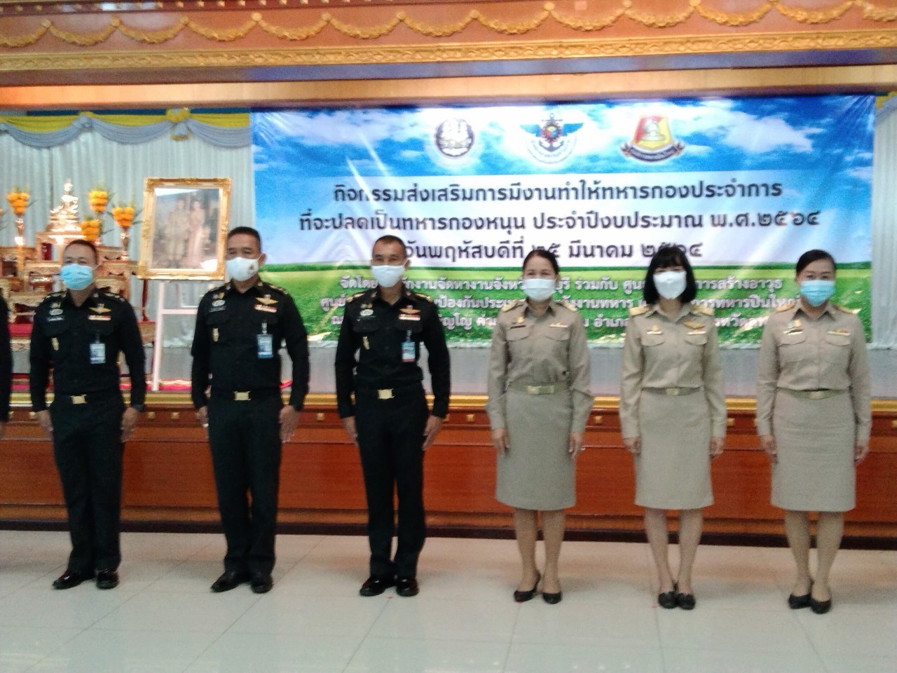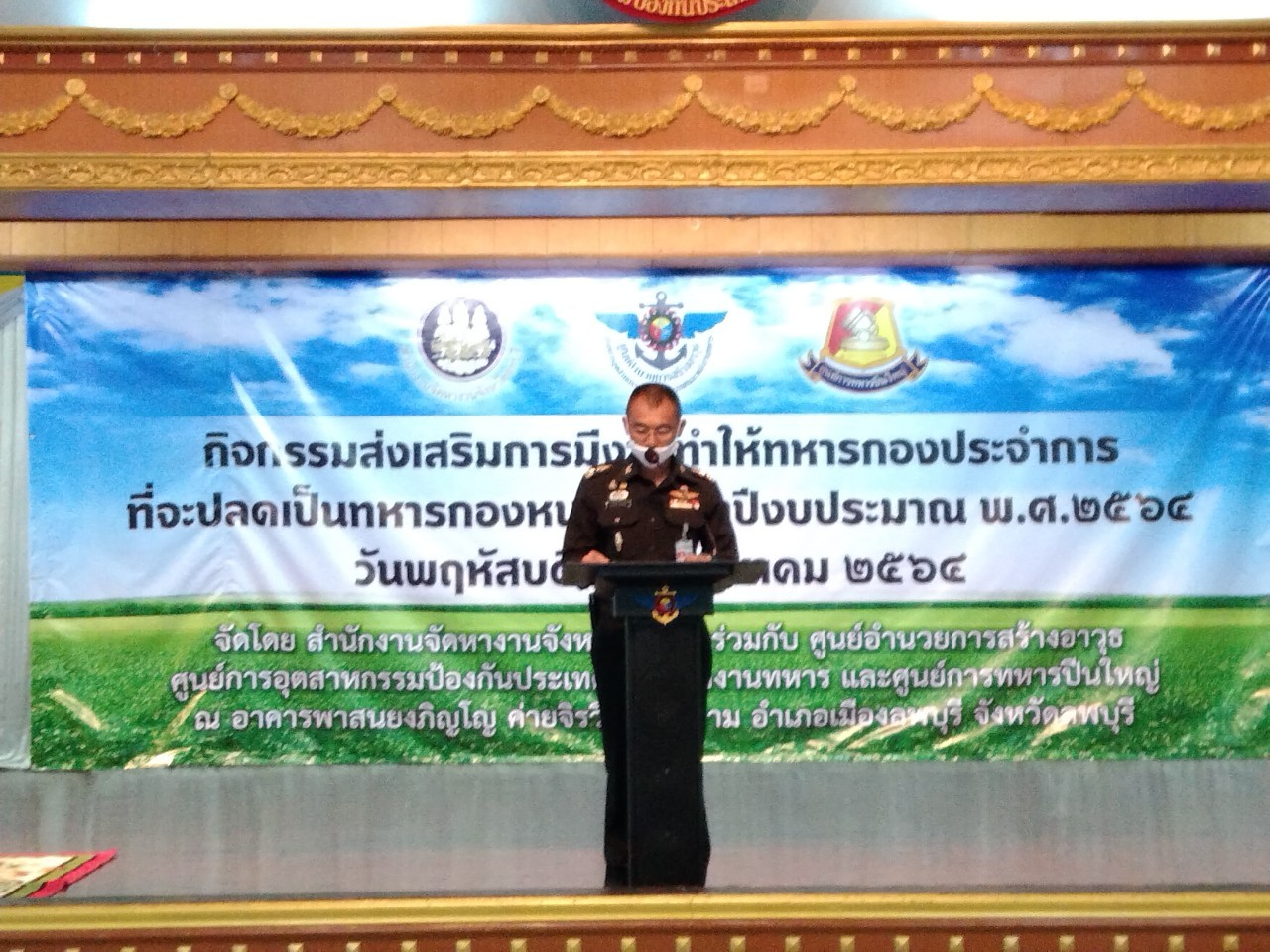 วันพฤหัสบดีที่ 25 มีนาคม 2564 เวลา 09.00 น. พลตรี ชำนาญ สุวะนาม รองผู้บัญชาการศูนย์อำนวยการสร้างอาวุธ ศูนย์การอุตสาหกรรมป้องกันประเทศและพลังงานทหาร เป็นประธานในพิธีเปิดงานโครงการเตรียมความพร้อมแก่กำลังแรงงาน กิจกรรมแนะแนวอาชีพและส่งเสริมอาชีพ แนะแนวอาชีพเพื่อการมีงานทำ กิจกรรมส่งเสริมการมีงานทำให้ทหารกองประจำการที่จะปลดเป็นทหารกองหนุน ประจำปีงบประมาณ พ.ศ.2564 ณ อาคารภาสนยงภิญโญ ศูนย์อำนวยการสร้างอาวุธ ศูนย์การอุตสาหกรรมป้องกันประเทศและพลังงานทหาร อำเภอเมืองลพบุรี จังหวัดลพบุรี จัดโดย สำนักงานจัดหางานจังหวัดลพบุรี ในการนี้ นางสาวสุกัญญา องค์วิเศษไพบูลย์ แรงงานจังหวัดลพบุรี พร้อมด้วย หัวหน้าส่วนราชการสังกัดกระทรวงแรงงานจังหวัดลพบุรี ร่วมในพิธีดังกล่าวดังกล่าว
