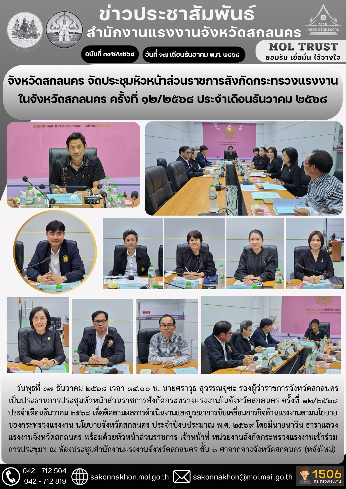 จังหวัดสกลนคร จัดประชุมหัวหน้าส่วนราชการสังกัดกระทรวงแรงงานในจังหวัดสกลนคร ครั้งที่ 12/2568 ประจำเดือนธันวาคม 2568