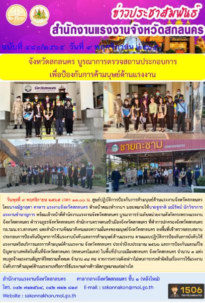 จังหวัดสกลนคร บูรณาการตรวจสถานประกอบการ เพื่อป้องกันการค้สมนุษย์ด้านแรงงาน