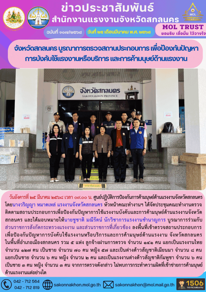 จังหวัดสกลนคร บูรณาการตรวจสถานประกอบการ เพื่อป้องกันปัญหาการบังคับใช้แรงงานหรือบริการ และการค้ามนุษย์ด้านแรงงาน