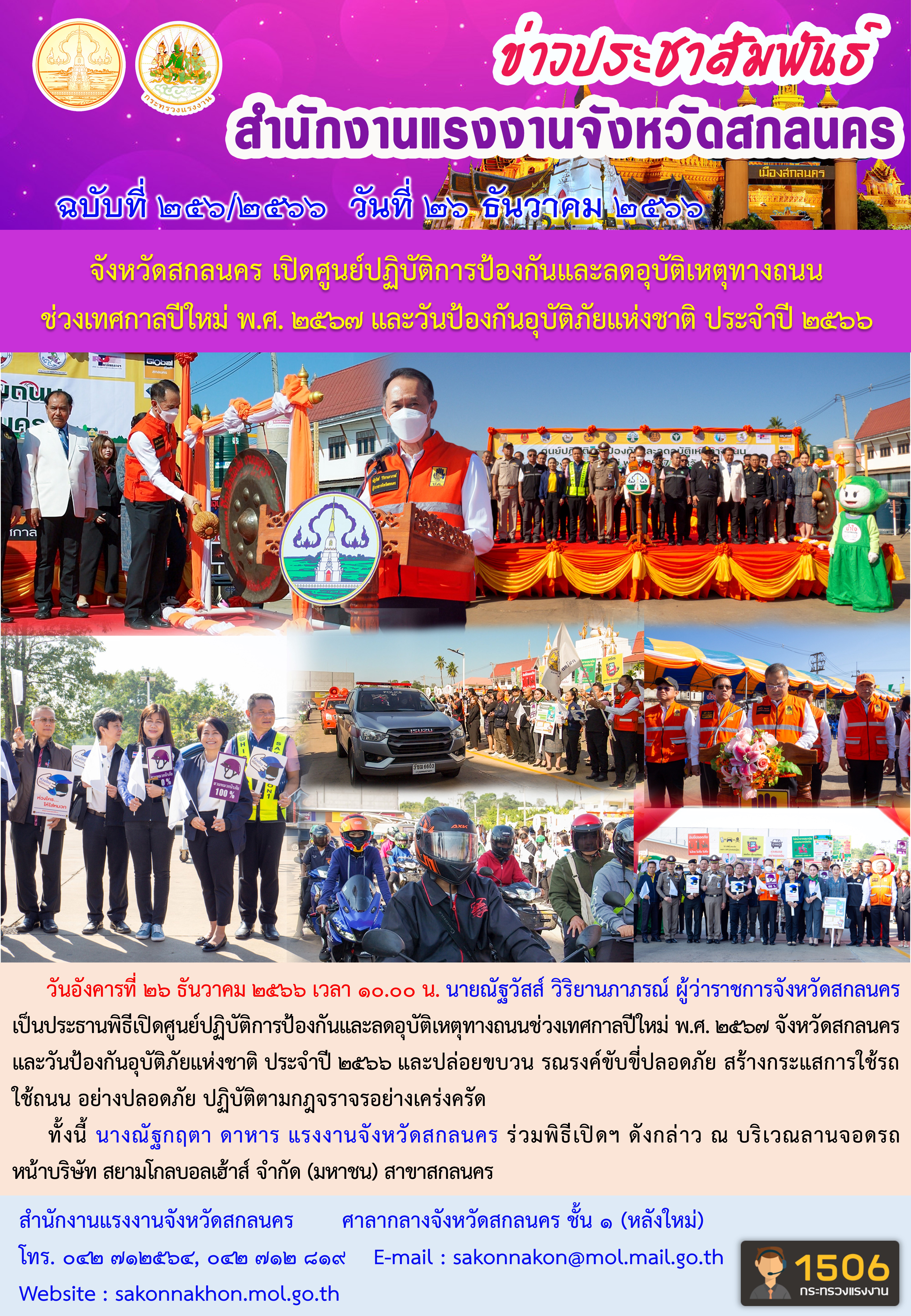 สรจ.สกลนคร เปิดศูนย์ปฏิบัติการป้องกันและลดอุบัติเหตุทางถนนช่วงเทศกาลปีใหม่ พ.ศ. 2567 และวันป้องกันอุบัติภัยแห่งชาติ ประจำปี 2566