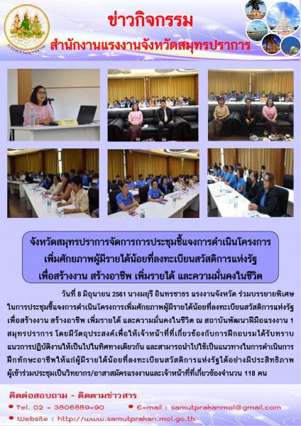 จังหวัดสมุทรปราการ จัดการการประชุมชี้แจงการดำเนินโครงการเพิ่มศักยภาพผู้มีรายได้น้อยที่ลงทะเบียนสวัสดิการแห่งรัฐ เพื่อสร้างงาน สร้างอาชีพ เพิ่มรายได้ และความมั่นคงในชีวิต