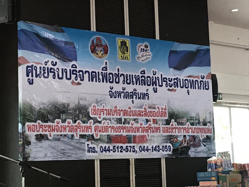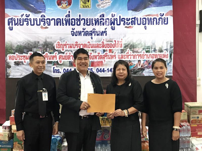 วันที่ 4 สิงหาคม 2560 เวลา 14.00 น. จังหวัดสุรินทร์ เปิดศูนย์รับบริจาคเพื่อช่วยเหลือผู้ประสบภัยจังหวัดสุรินทร์ ในการนี้ นางสาวกานต์กมล ชุมภูทอง แรงงานจังหวัดสุรินทร์และนางอุสนีย์ ศิลปศร ประกันสังคมจังหวัดสุรินทร์ ร่วมบริจาค โดยนายโชคดี อมรวัฒน์ และนายเลิศบุศย์ กองทอง รองผู้ว่าราชการจังหวัดสุรินทร์ เป็นผู้รับมอบ ณ หอประชุมจังหวัดสุรินทร์ อำเภอเมือง จังหวัดสุรินทร์