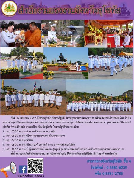 จังหวัดสุโขทัย จัดงานรัฐพิธี วันพ่อขุนรามคำแหงมหาราช เพื่อเฉลิมพระเกียรติและน้อมรำลึกพระมหากรุณาธิคุณของพ่อขุนรามคำแหงมหาราช ณ พระบรมราชานุสาวรีย์พ่อขุนรามคำแหงมหาราช อุทยานประวัติศาสตร์สุโขทัย