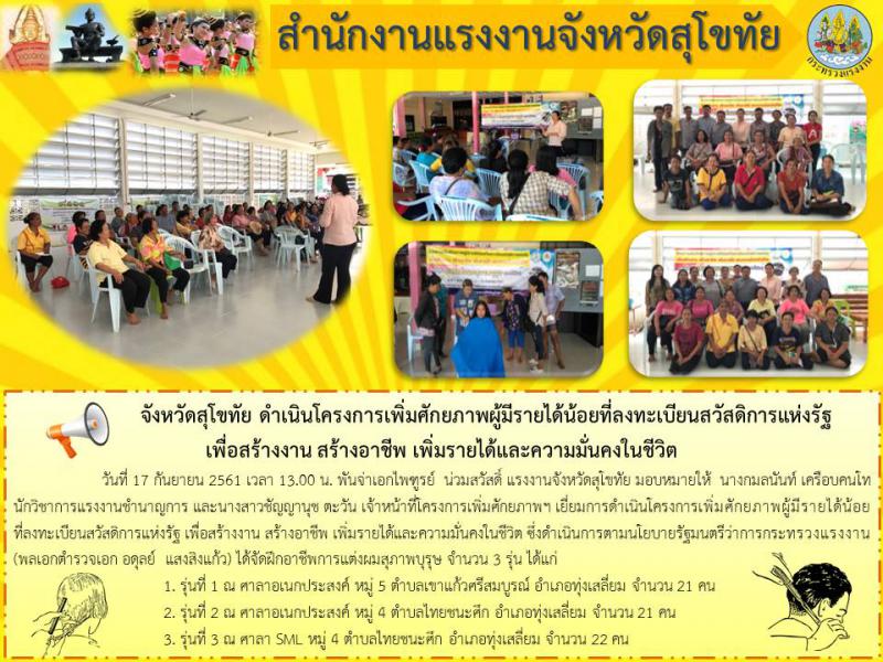 จังหวัดสุโขทัย ดำเนินโครงการเพิ่มศักยภาพผู้มีรายได้น้อยที่ลงทะเบียนสวัสดิการแห่งรัฐ เพื่อสร้างงาน สร้างอาชีพ เพิ่มรายได้และความมั่นคงในชีวิต