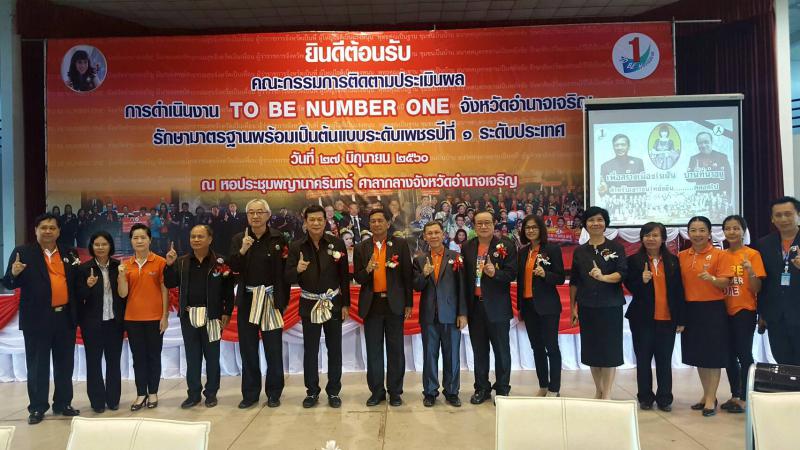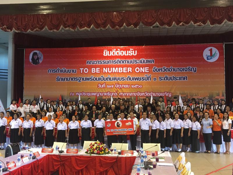 จังหวัดอำนาจเจริญรับการตรวจประเมินผลการดำเนินงาน TO BE NUMBER ONE ระดับประเทศ เมื่อวันอังคาร ที่ 27 มิถุนายน 2560 เวลา 14.30 น. ณ หอประชุมพญานาครินทร์ ศาลากลางจังหวัดอำนาจเจริญ นายสิริรัฐ ชุมอุปการ ผู้ว่าราชการจังหวัดอำนาจเจริญ ให้การต้อนรับนายประวิทย์ เคียงผล หัวหน้าผู้ตรวจราชการกระทรวงแรงงาน ประธานคณะกรรมการติดตามประเมินผลการดำเนินงาน TO BE NUMBER ONE จังหวัดอำนาจเจริญ พร้อมคณะ ที่มาตรวจเยี่ยมการการปฏิบัติงานและเก็บคะแนนระดับประเทศรอบที่ 1 พื้นที่จังหวัดอำนาจเจริญ ประเภทจังหวัดTO BE NUMBER ONE มาตรฐานพร้อมเป็นต้นแบบระดับเพชร ปีที่ 1 กิจกรรมประกอบด้วยการแสดงของสมาชิกชมรมTO BE NUMBER ONE การจัดบูธนิทรรศการเสนอผลการดำเนินงานของชมรมTO BE NUMBER ONE พร้อมนำเสนอผลการดำเนินงาน TO BE NUMBER ONE รักษามาตรฐานพร้อมเป็นต้นแบบระดับเพชรปีที่ 1 ต่อคณะกรรมการฯ โดยมีหัวหน้าส่วนราชการ คณะกรรมการฯ และสมาชิกชมรม TO BE NUMBER ONE จังหวัดอำนาจเจริญ ร่วมต้อนรับและแสดงผลการดำเนินงาน