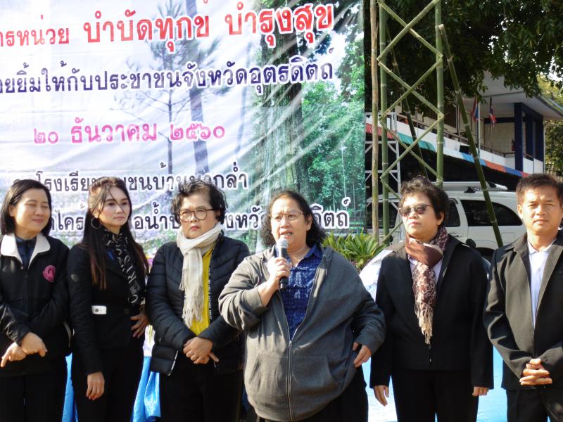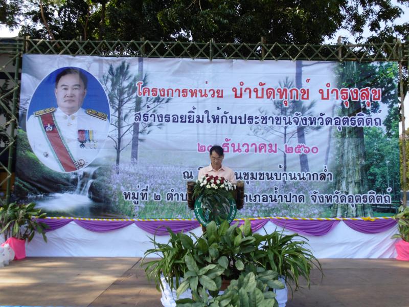 เมื่อวันพุธที่ 20 ธันวาคม 2560 เวลา 08.30 น. นางสาวปาริชาติ สวนใจ แรงงานจังหวัดอุตรดิตถ์ มอบหมายนางสุเพ็ญ จิตต์ใจฉ่ำ เจ้าพนักงานการเงินและบัญชีชำนาญงาน ร่วมกิจกรรมการออกหน่วยบำบัดทุกข์ บำรุงสุข สร้างรอยยิ้มให้ประชาชนจังหวัดอุตรดิตถ์ ณ โรงเรียนบ้านนากล่ำ หมู่ที่ 2 ตำบลน้ำไคร้ อำเภอน้ำปาด จังหวัดอุตรดิตถ์ โดยมีนายสุมิตร เกิดกล่ำ รองผู้ว่าราชการจังหวัดอุตรดิตถ์ เป็นประธาน