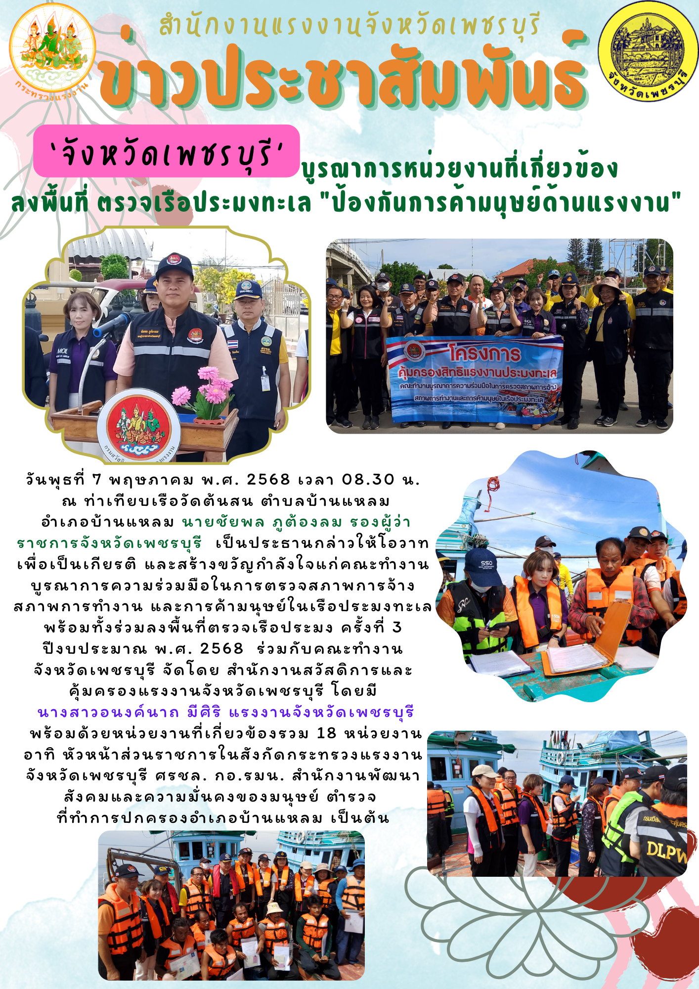 วันพุธที่ 7 พฤษภาคม พ.ศ. 2568 เวลา 08.30 น. ณ ท่า เทียบเรือวัดต้นสน ตำบลบ้านแหลม อำเภอบ้านแหลม นายชัยพล ภูต้องลม รองผู้ว่าราชการจังหวัดเพชรบุรี เป็นประธานกล่าวให้โอวาท เพื่อเป็นเกียรติ และสร้างขวัญกำลังใจแก่คณะทำงานบูรณาการความร่วมมือในการตรวจสภาพการจ้าง สภาพการทำงาน และการค้ามนุษย์ในเรือประมงทะเล พร้อมทั้งร่วมลงพื้นที่ตรวจเรือประมง ครั้งที่ 3 ปีงบประมาณ พ.ศ. 2568 ร่วมกับคณะทำงานจังหวัดเพชรบุรี จัดโดย สำนักงานสวัสดิการและคุ้มครองแรงงานจังหวัดเพชรบุรี โดยมี นางสาวอนงค์นาถ มีศิริ แรงงานจังหวัดเพชรบุรี พร้อมด้วยหน่วยงานที่เกี่ยวข้องรวม 18 หน่วยงาน อาทิ หัวหน้าส่วนราชการในสังกัดกระทรวงแรงงานจังหวัดเพชรบุรี ศรชล. กอ.รมน. สำนักงานพัฒนาสังคมและความมั่นคงของมนุษย์ ตำรวจ ที่ทำการปกครองอำเภอบ้านแหลม เป็นต้น