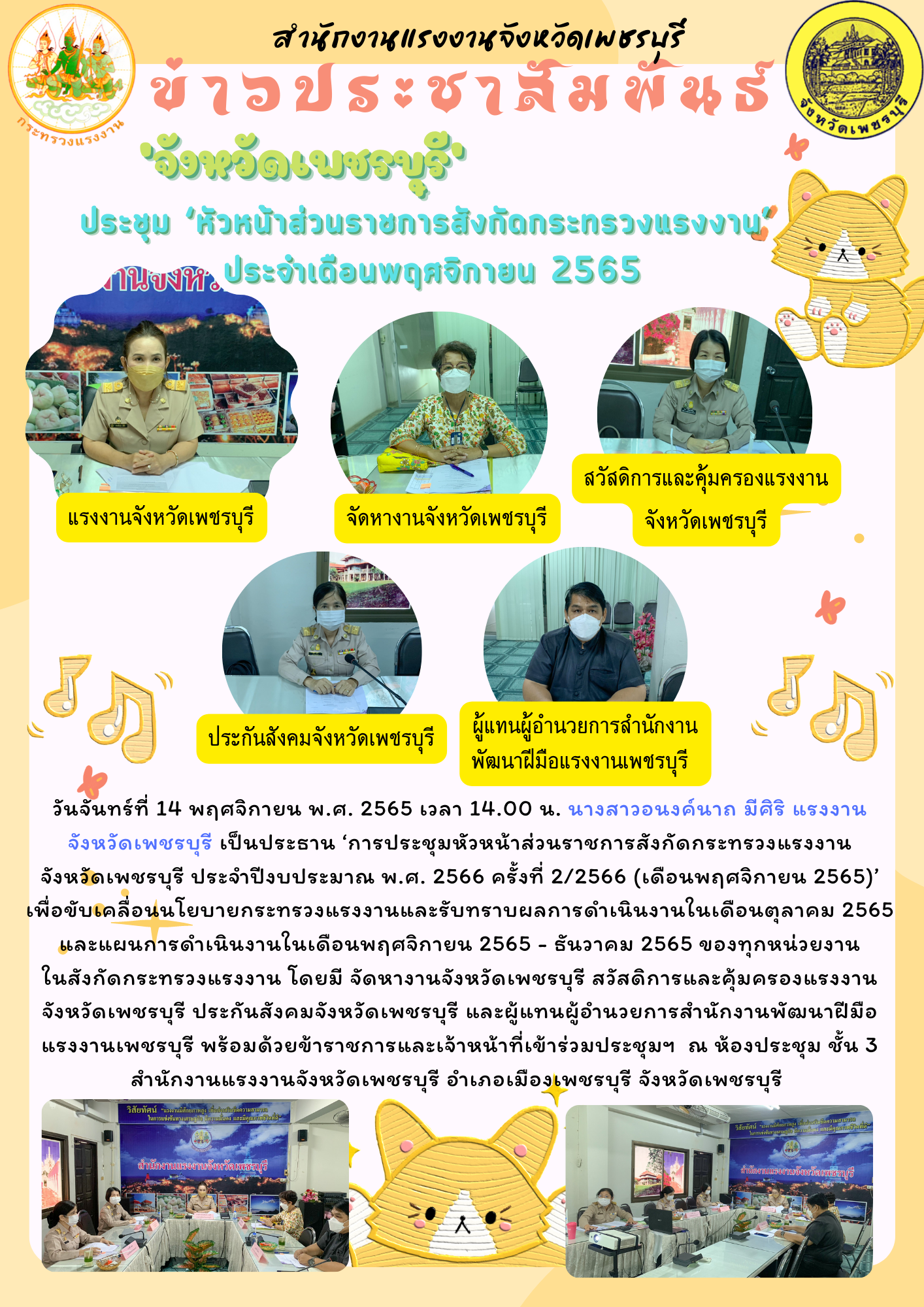 วันจันทร์ที่ 14 พฤศจิกายน พ.ศ. 2565 เวลา 14.00 น. นางสาวอนงค์นาถ มีศิริ แรงงานจังหวัดเพชรบุรี เป็นประธาน ‘การประชุมหัวหน้าส่วนราชการสังกัดกระทรวงแรงงานจังหวัดเพชรบุรี ประจำปีงบประมาณ พ.ศ. 2566 ครั้งที่ 2/2566 (เดือนพฤศจิกายน 2565)’ เพื่อขับเคลื่อนนโยบายกระทรวงแรงงานและรับทราบผลการดำเนินงานในเดือนตุลาคม 2565 และแผนการดำเนินงานในเดือนพฤศจิกายน 2565 – ธันวาคม 2565 ของทุกหน่วยงานในสังกัดกระทรวงแรงงาน โดยมี จัดหางานจังหวัดเพชรบุรี สวัสดิการและคุ้มครองแรงงานจังหวัด ประกันสังคมจังหวัดเพชรบุรี และผู้แทนผู้อำนวยการสำนักงานพัฒนาฝีมือแรงงานเพชรบุรี พร้อมด้วยข้าราชการและเจ้าหน้าที่เข้าร่วมประชุมฯ ณ ห้องประชุม ชั้น 3 สำนักงานแรงงานจังหวัดเพชรบุรี อำเภอเมืองเพชรบุรี จังหวัดเพชรบุรี