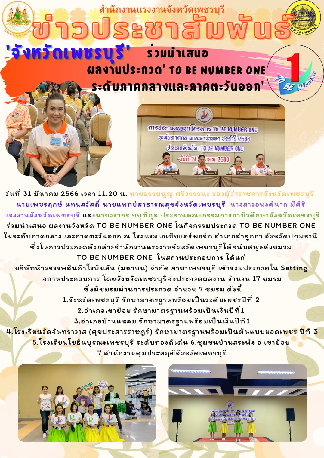 วันที่ 31 มีนาคม 2566 เวลา 11.20 น. นายธรรมนูญ ศรีวรรธนะ รองผู้ว่าราชการจังหวัดเพชรบุรี นายเพชรฤกษ์ แทนสวัสดิ์ นายแพทย์สาธารณสุขจังหวัดเพชรบุรี นางสาวอนงค์นาถ มีศิริ แรงงานจังหวัดเพชรบุรี และนายวรากร ชยุติกุล ประธานคณะกรรมการอาชีวศึกษาจังหวัดเพชรบุรี ร่วมนำเสนอ ผลงานจังหวัด TO BE NUMBER ONE ในกิจกรรมประกวด TO BE NUMBER ONE ในระดับภาคกลางและภาคตะวันออก ณ โรงแรมเอเชียแอร์พอร์ท อำเภอลำลูกกา จังหวัดปทุมธานี ซึ่งในการประกวดดังกล่าวสำนักงานแรงงานจังหวัดเพชรบุรีได้สนับสนุนส่งชมรม TO BE NUMBER ONE ในสถานประกอบการ ได้แก่ บริษัทห้างสรรพสินค้าโรบินสัน (มหาชน) จำกัด สาขาเพชรบุรี เข้าร่วมประกวดใน Setting สถานประกอบการ โดยจังหวัดเพชรบุรีส่งประกวดผลงาน จำนวน 17 ชมรม ซึ่งมีชมรมผ่านการประกวด จำนวน 7 ชมรม ดังนี้