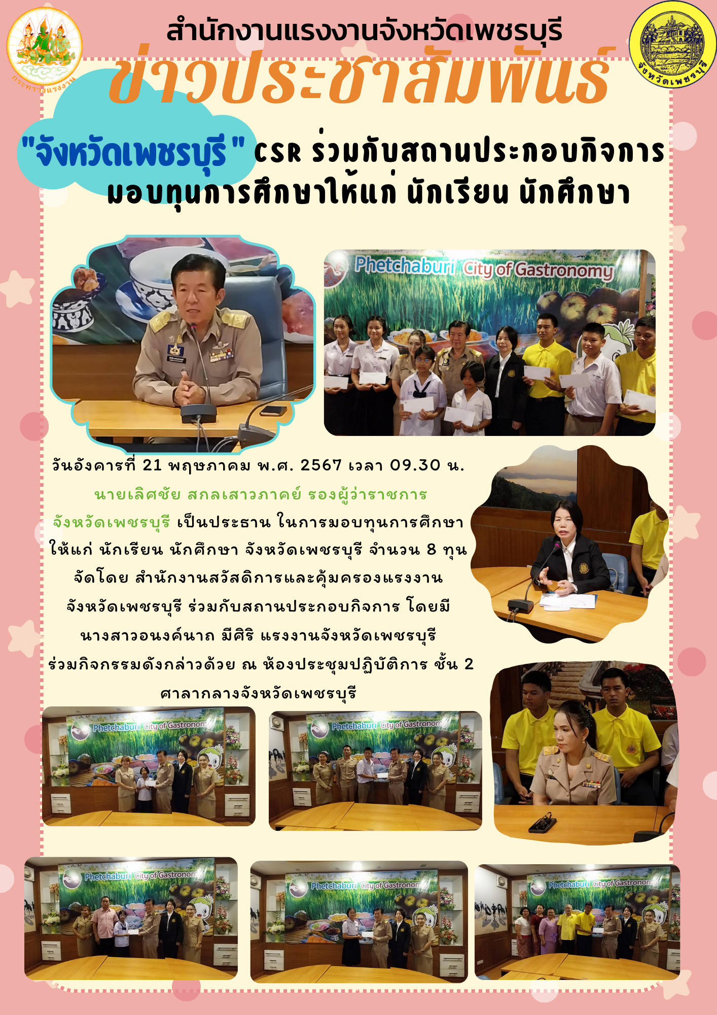 วันอังคารที่ 21 พฤษภาคม พ.ศ. 2567 เวลา 09.30 น. นายเลิศชัย สกลเสาวภาคย์ รองผู้ว่าราชการจังหวัดเพชรบุรี เป็นประธาน ในการมอบทุนการศึกษาให้แก่ นักเรียน นักศึกษา จังหวัดเพชรบุรี จัดโดย สำนักงานสวัสดิการและคุ้มครองแรงงานจังหวัดเพชรบุรี ร่วมกับสถานประกอบกิจการ CSR โดยมี นางสาวอนงค์นาถ มีศิริ แรงงานจังหวัดเพชรบุรี ร่วมกิจกรรมดังกล่าวด้วย ณ ห้องประชุมปฏิบัติการ ชั้น 2 ศาลากลางจังหวัดเพชรบุรี