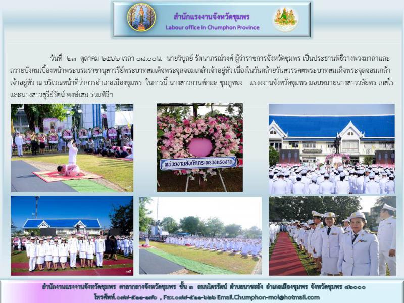 จัดหวัดชุมพร จัดพิธีวางพวงมาลาและถวายบังคม เนื่องในวันคล้ายวันสวรรคตพระบาทสมเด็จพระจุลจอมเกล้าเจ้าอยู่หัว
