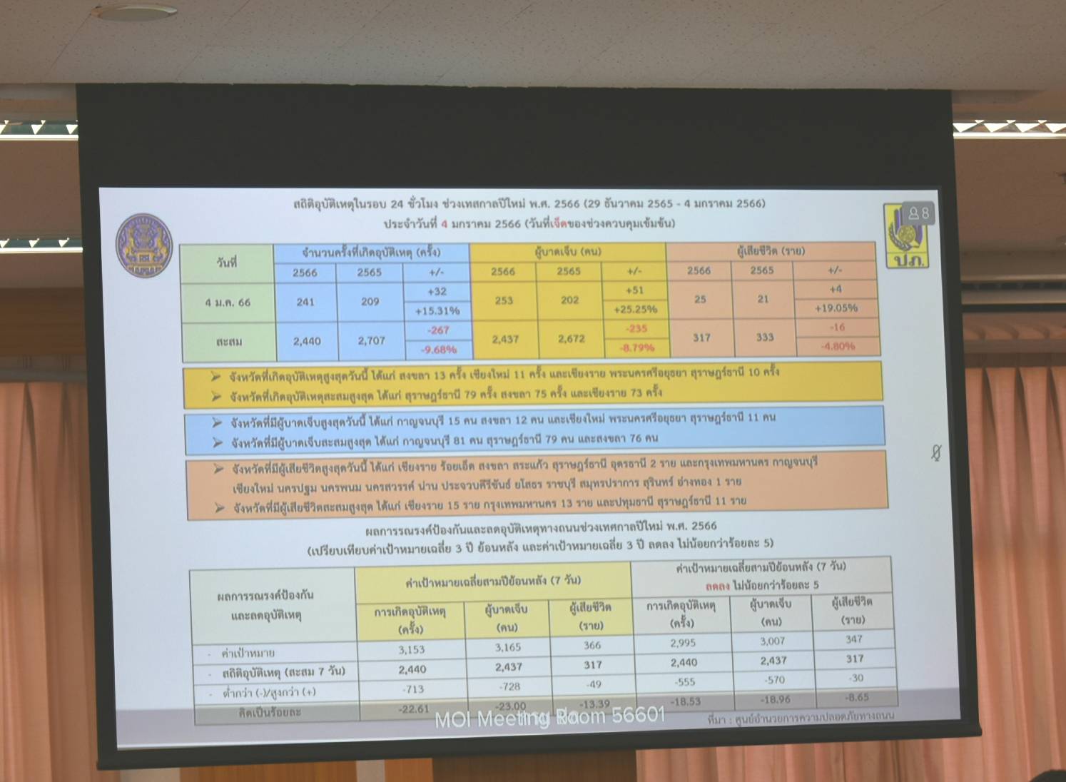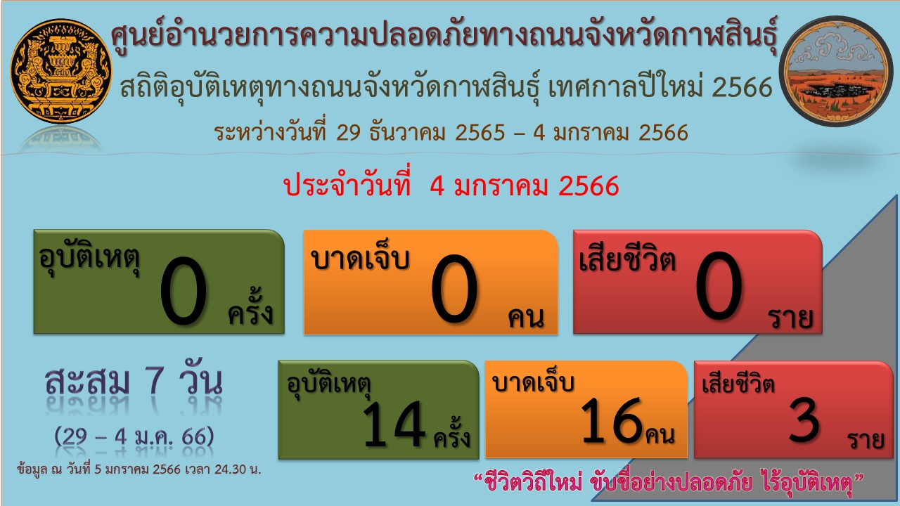 วันพฤหัสบดีที่ 5 มกราคม พ.ศ. 2566 นางพนิดา เสถียรจิตร แรงงานจังหวัดกาฬสินธุ์ มอบหมายให้นายเสมือน ศรีพอ นักวิชาการแรงงานชำนาญการ ร่วมการประชุมคณะกรรมการศูนย์อำนวยการความปลอดภัยทางถนนจังหวัดกาฬสินธุ์ การป้องกันและลดอุบัติเหตุทางถนนช่วงเทศกาลปีใหม่ พ.ศ. 2566 ณ ห้องประชุมฟ้าแดดสงยาง ชั้น 2 ศาลากลางจังหวัดกาฬสินธุ์ โดยมีนายศุภศิษย์ กอเจริญยศ ผู้ว่าราชการจังหวัดกาฬสินธุ์ เป็นประธานการประชุมทั้งนี้ ศูนย์อำนวยการความปลอดภัยทางถนนจังหวัดกาฬสินธุ์ สรุปสถิติอุบัติเหตุทางถนนจังหวัดกาฬสินธุ์ เทศกาลปีใหม่ 2566 ระหว่างวันที่ 29 ธันวาคม 2565 – วันที่ 4 มกราคม 2566 ยอดสะสม 7 วัน พบว่า เกิดอุบัติเหตุ จำนวน 14 ครั้ง พื้นที่ (อ.กุฉินารายณ์ 2 ครั้ง / อ.เมืองกาฬสินธุ์ 5 ครั้ง / อ.สามชัย 2 ครั้ง / อ.ยางตลาด 1 ครั้ง / อ.เขาวง 1 ครั้ง/ อ.นามน 1 ครั้ง/ อ.สมเด็จ 1 ครั้ง และ อ.กมลาไสย 1 ครั้ง) ผู้บาดเจ็บ จำนวน 16 คน