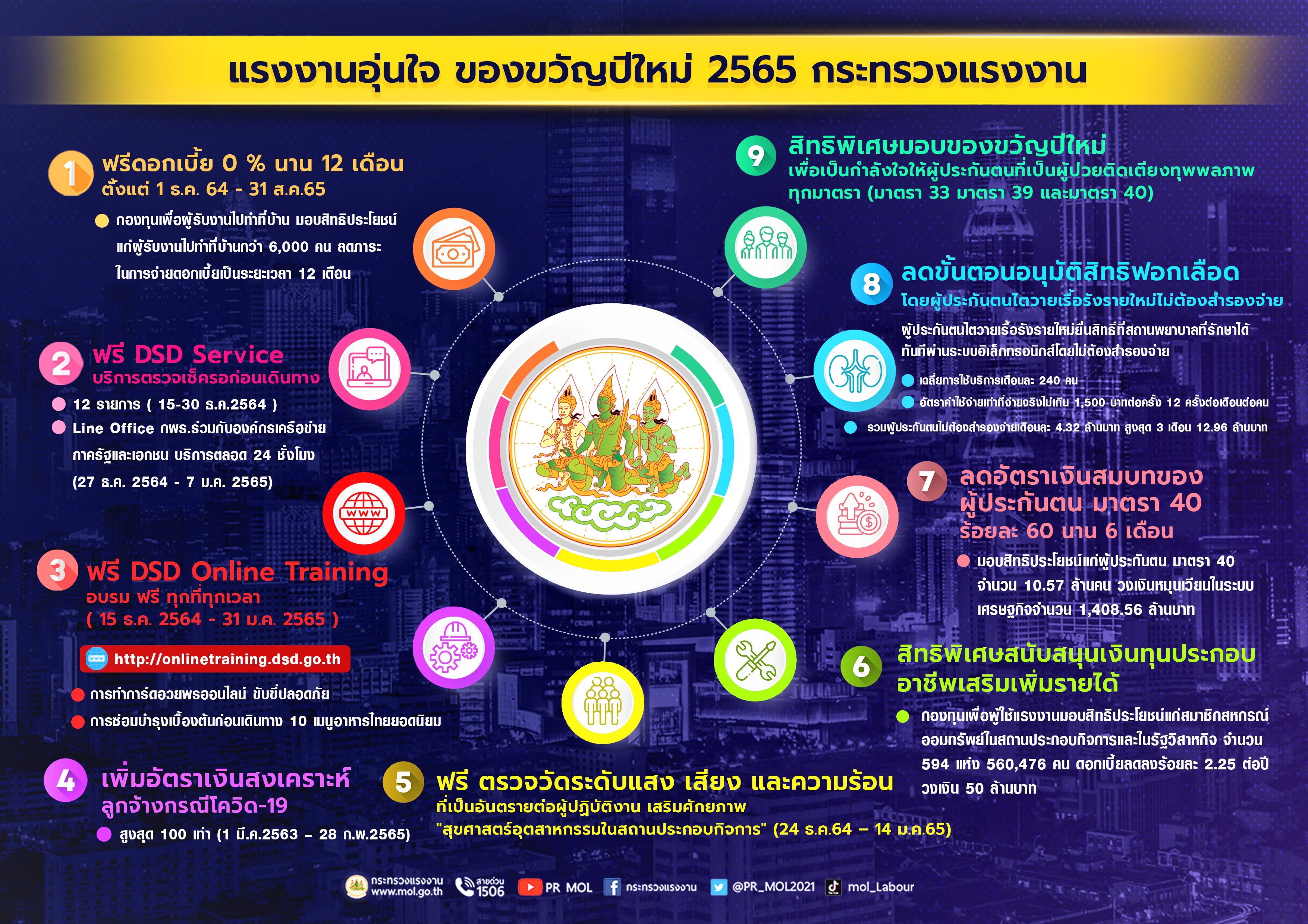 เมื่อวันที่ 23 ธันวาคม 2564 นายสุชาติ ชมกลิ่น รัฐมนตรีว่าการกระทรวงแรงงาน เปิดเผยว่าท่านนายกรัฐมนตรีและรัฐมนตรีว่าการกระทรวงกลาโหม พล.อ.ประยุทธ์ จันทร์โอชา ได้มีความห่วงใยพี่น้องผู้ใช้แรงงานทุกคน ทุกกลุ่ม และได้สั่งการให้แต่ละหน่วยงานมอบของขวัญปีใหม่เพื่อเป็นกำลังใจแก่ประชาชนในช่วงเทศกาลปีใหม่และแบ่งเบาภาระในช่วงที่ยังได้รับผลกระทบจากโควิด-19 กระทรวงแรงงาน ภายใต้การกำกับดูแลของ พล.อ.ประวิตร วงษ์สุวรรณ รองนายกรัฐมนตรี เพื่อสร้างขวัญและกำลังใจให้พี่น้องผู้ใช้แรงงาน ผู้ประกันตน ลูกจ้าง นายจ้าง ผู้ประกอบอาชีพอิสระ และประชาชนทั่วไป ได้มีคุณภาพชีวิตที่ดียิ่งขึ้น โดยในส่วนของกระทรวงแรงงาน ในปีนี้ได้มอบของขวัญปีใหม่ ภายใต้เคมเปญ “แรงงานอุ่นใจ ของขวัญปีใหม่ 2565 กระทรวงแรงงาน” จำนวน 9 ชิ้น เพื่อมอบความสุขแก่พี่น้องผู้ใช้แรงงาน ดังนี้
