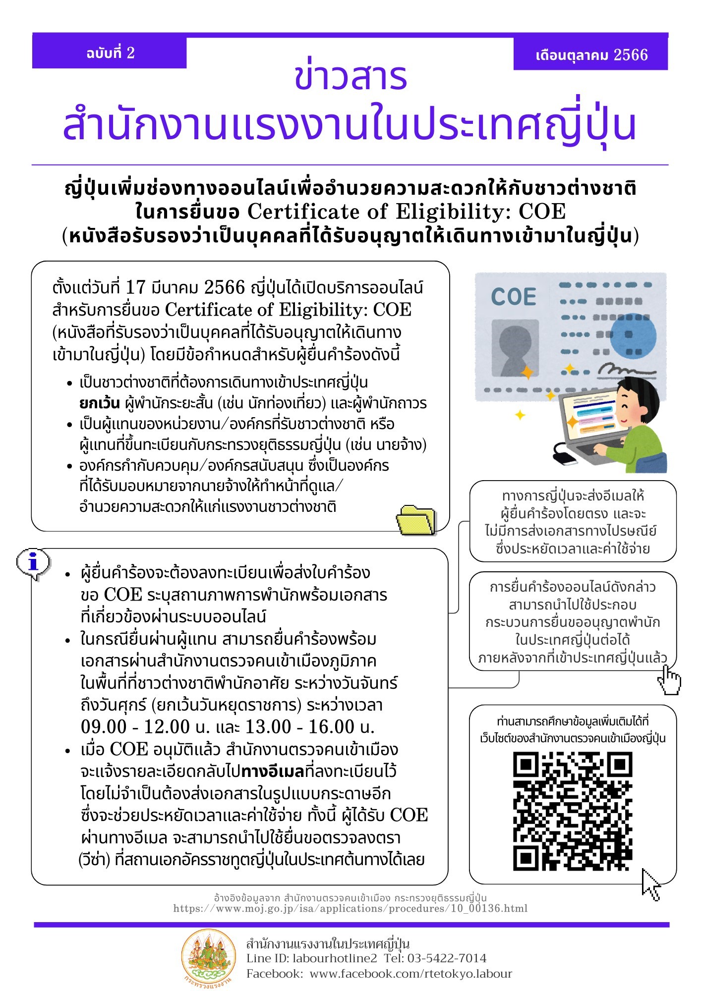 สำนักงานแรงงานในประเทศญี่ปุ่นขอประชาสัมพันธ์ข่าวสาร เรื่อง “ญี่ปุ่นเพิ่มช่องทางออนไลน์เพื่ออำนวยความสะดวกให้กับชาวต่างชาติในการยื่นขอ Certificate of Eligibility: COE (หนังสือรับรองว่าเป็นบุคคลที่ได้รับอนุญาตให้เดินทางเข้าญี่ปุ่น)” รายละเอียดตามที่แนบ