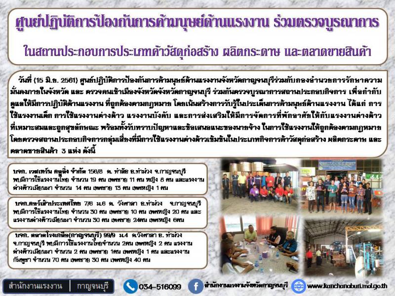 วันที่ (15 มิ.ย. 2561) ศูนย์ปฏิบัติการป้องกันการค้ามนุษย์ด้านแรงงานจังหวัดกาญจนบุรีร่วมกับกองอำนวยการรักษาความมั่นคงภายในจังหวัด และ ตรวจคนเข้าเมืองจังหวัดจังหวัดกาญจนบุรี ร่วมกันตรวจบูรณาการสถานประกอบกิจการ เพื่อกำกับดูแลให้มีการปฏิบัติด้านแรงงาน ที่ถูกต้องตามกฎหมาย โดยเน้นสร้างการรับรู้ในประเด็นการค้ามนุษย์ด้านแรงงาน ได้แก่ การใช้แรงงานเด็ก การใช้แรงงานต่างด้าวแรงงานบังคับ และการส่งเสริมให้มีการจัดการที่พักอาศัยให้กับแรงงานต่างด้าวที่เหมาะสมและถูกสุขลักษณะ พร้อมทั้งรับทราบปัญหาและข้อเสนอแนะของนายจ้าง ในการใช้แรงงานให้ถูกต้องตามกฎหมาย โดยตรวจสถานประกอบกิจการกลุ่มเสี่ยงที่มีการใช้แรงงานต่างด้าวเข้มข้นในประเภทกิจการค้าวัสดุก่อสร้าง ผลิตกระดาษ และตลาดขายสินค้า 3 แห่ง ดังนี้ 1.บริษัทเวสเทิร์น คูลลิ่ง จำกัด 2.บริษัทคอร์เฮ้าประเทศไทย 3.ตลาดโรงเกลือ (กาญจนบุรี)
