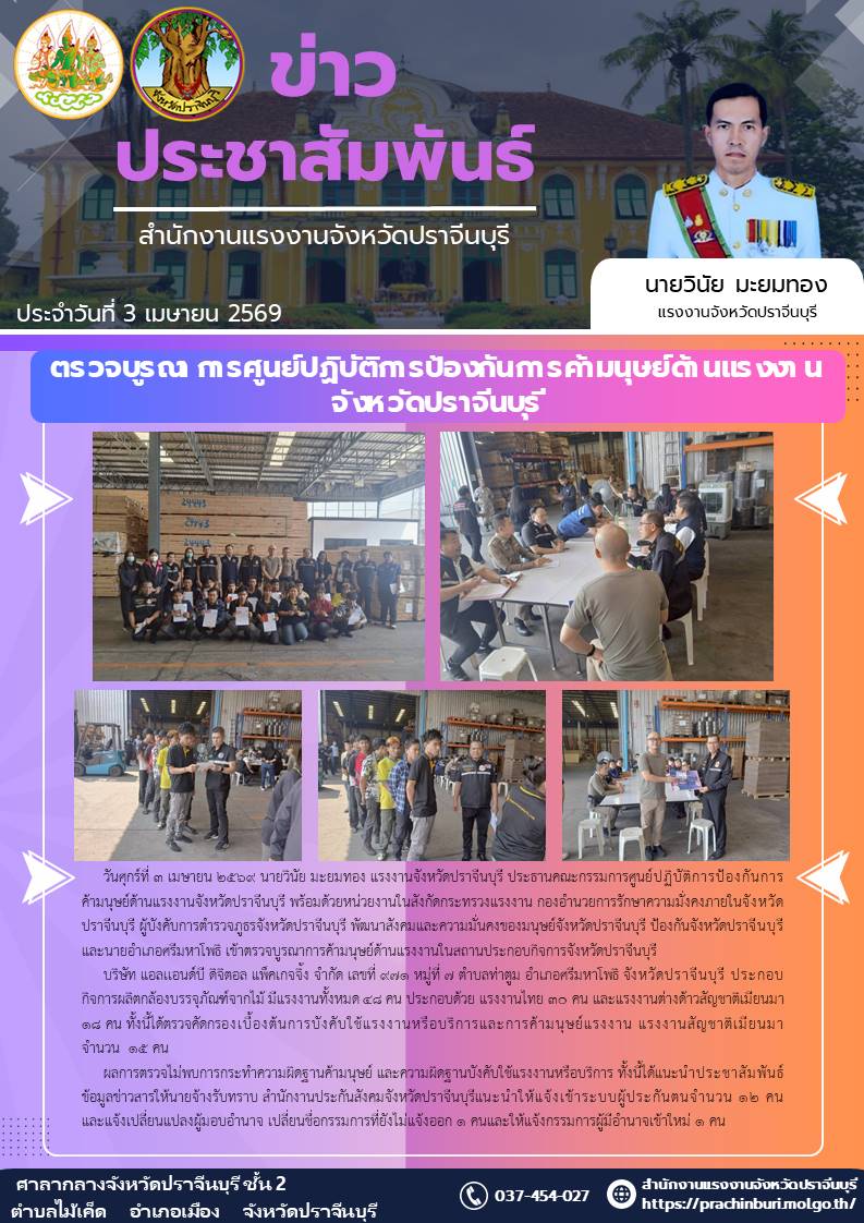 วันศุกร์ที่ 3 เมษายน 2569 นายวินัย มะยมทอง แรงงานจังหวัดปราจีนบุรี ประธานคณะกรรมการศูนย์ปฏิบัติการป้องกันการ ค้ามนุษย์ด้านแรงงานจังหวัดปราจีนบุรี พร้อมด้วยหน่วยงานในสังกัดกระทรวงแรงงาน กองอำนวยการรักษาความมั่งคงภายในจังหวัดปราจีนบุรี ผู้บังคับการตำรวจภูธรจังหวัดปราจีนบุรี พัฒนาสังคมและความมั่นคงของมนุษย์จังหวัดปราจีนบุรี ป้องกันจังหวัดปราจีนบุรีและนายอำเภอศรีมหาโพธิ เข้าตรวจบูรณาการค้ามนุษย์ด้านแรงงานในสถานประกอบกิจการจังหวัดปราจีนบุรี บริษัท แอลเเอนด์บี ดิจิตอล แพ็คเกจจิ้ง จำกัด เลขที่ 971 หมู่ที่ 7 ตำบลท่าตูม อำเภอศรีมหาโพธิ จังหวัดปราจีนบุรี ประกอบกิจการผลิตกล้องบรรจุภัณฑ์จากไม้ มีแรงงานทั้งหมด 48 คน ประกอบด้วย แรงงานไทย 30 คน และแรงงานต่างด้าวสัญชาติเมียนมา 18 คน ทั้งนี้ได้ตรวจคัดกรองเบื้องต้นการบังคับใช้แรงงานหรือบริการและการค้ามนุษย์แรงงาน แรงงานสัญชาติเมียนมา จำนวน 15 คน ผลการตรวจไม่พบการกระทำความผิดฐานค้ามนุษย์ และความผิดฐานบังคับใช้แรงงานหรือบริการ ทั้งนี้ได้แนะนำประชาสัมพันธ์ข้อมูลข่าวสารให้นายจ้างรับทราบ สำนักงานประกันสังคมจังหวัดปราจีนบุรีแนะนำให้แจ้งเข้าระบบผู้ประกันตนจำนวน 12 คน และแจ้งเปลี่ยนแปลงผู้มอบอำนาจ เปลี่ยนชื่อกรรมการที่ยังไม่แจ้งออก 1 คนและให้แจ้งกรรมการผู้มีอำนาจเข้าใหม่ 1 คน