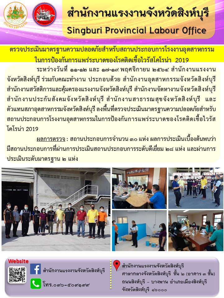 สรจ.สิงห์บุรี ตรวจประเมินมาตรฐานความปลอดภัยสำหรับสถานประกอบการโรงงานอุตสาหกรรม ในการป้องกันการแพร่ระบาดของโรคติดเชื้อไวรัสโคโรน่า 2019