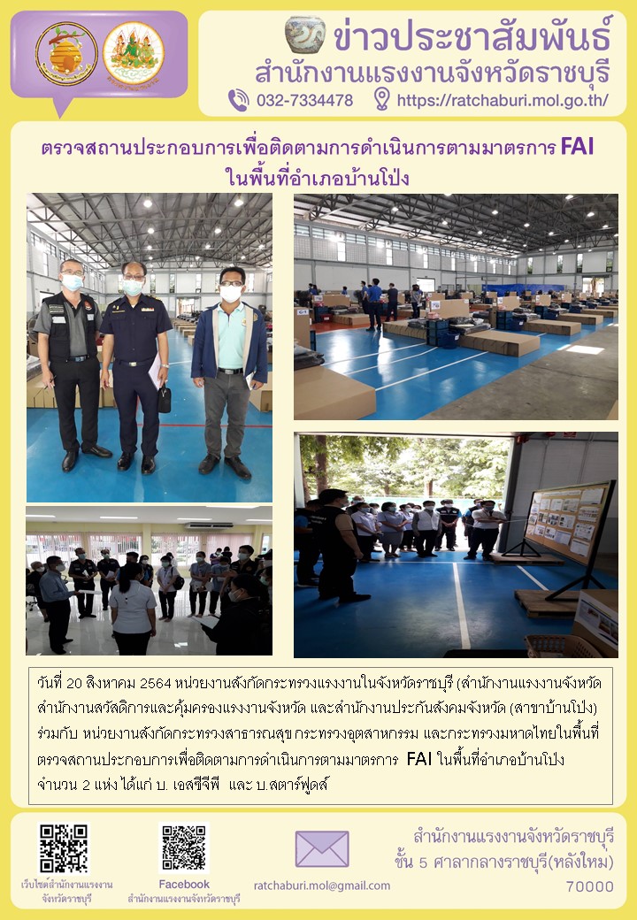 ตรวจสถานประกอบการเพื่อติดตามการดำเนินการตามมาตรการ FAI ในพื้นที่อำเภอบ้านโป่ง
