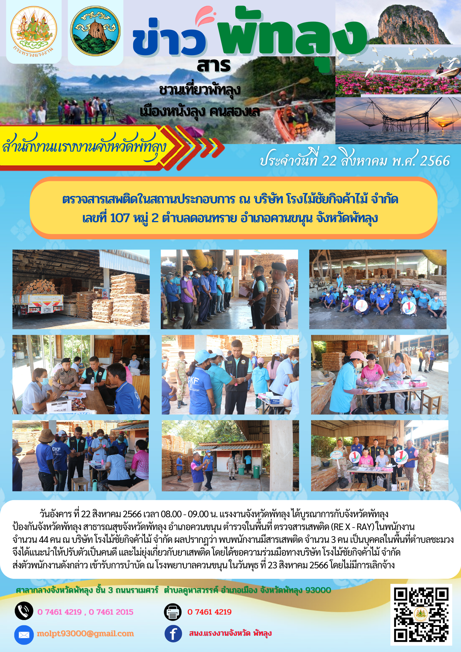 วันอังคาร ที่ 22 สิงหาคม 2566 เวลา 08.00 – 09.00 น. แรงงานจังหวัดพัทลุง ได้บูรณาการกับจังหวัดพัทลุง ป้องกันจังหวัดพัทลุง สาธารณสุขจังหวัดพัทลุง อำเภอควนขนุน ตำรวจในพื้นที่ ตรวจสารเสพติด (Re X – ray) ในพนักงาน จำนวน 44 คน ณ บริษัท โรงไม้ชัยกิจค้าไม้ จำกัด ผลปรากฎว่า พบพนักงานมีสารเสพติด จำนวน 3 คน เป็นบุคคลในพื้นที่ตำบลชะมวง จึงได้แนะนำให้ปรับตัวเป็นคนดี และไม่ยุ่งเกี่ยวกับยาเสพติด โดยได้ขอความร่วมมือทางบริษัท โรงไม้ชัยกิจค้าไม้ จำกัด ส่งตัวพนักงานดังกล่าว เข้ารับการบำบัด ณ โรงพยาบาลควนขนุน ในวันพุธ ที่ 23 สิงหาคม 2566 โดยไม่มีการเลิกจ้าง