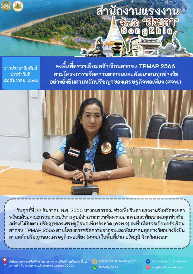 วันศุกร์ที่ 22 ธันวาคม พ.ศ. 2566 นางอมรวรรณ ช่วงเพ็ชจินดา แรงงานจังหวัดสงขลา พร้อมด้วยคณะกรรมการบริหารศูนย์อำนวยการขจัดความยากจนและพัฒนาคนทุกช่วงวัยอย่างยั่งยืนตามปรัชญาของเศรษฐกิจพอเพียงจังหวัด (คจพ.จ) ลงพื้นที่ตรวจเยี่ยมครัวเรือนยากจน TPMAP 2566 ตามโครงการขจัดความยากจนและพัฒนาคนทุกช่วงวัยอย่างยั่งยืนตามหลักปรัชญาของเศรษฐกิจพอเพียง (ศจพ.) ในพื้นที่อำเภอรัตภูมิ จังหวัดสงขลา