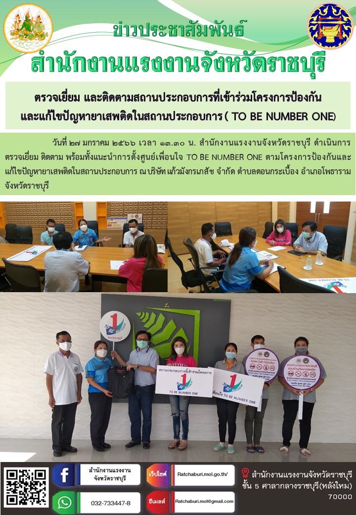 สรจ.ราชบุรี ตรวจเยี่ยม และติดตามสถานประกอบการที่เข้าร่วมโครงการป้องกันและแก้ไขปัญหายาเสพติดในสถานประกอบการ ( TO BE NUMBER ONE)