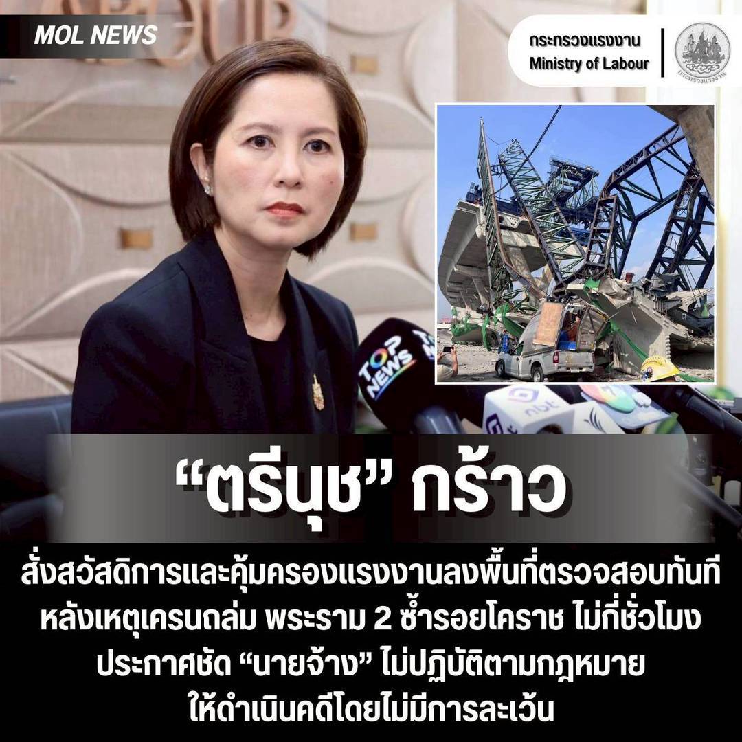 จากเหตุการณ์เครนถล่มซ้ำที่ถนนพระรามที่ 2 เมื่อเช้าวันที่ 15 ม.ค. หลังเกิดเหตุโศกนาฏกรรมเครนยักษ์ถล่มที่อ.สีคิ้ว จ.นครราชสีมา ในโครงการรถไฟฟ้าความเร็วสูง ไม่กี่ชั่วโมง นางสาวตรีนุช เทียนทอง รัฐมนตรีว่าการกระทรวงแรงงาน ได้สั่งการให้กรมสวัสดิการและคุ้มครองแรงงานลงพื้นที่เกิดเหตุเพื่อตรวจสอบความเสียหายทันทีพร้อมทั้งให้เจ้าพนักงานตรวจความปลอดภัย และสำนักงานประกันสังคม เข้าเจรจากับทั้งนายจ้างและลูกจ้าง เพื่อให้การดูแลช่วยเหลือโดยเร่งด่วน พร้อมกันนี้ ได้สั่งการให้ตรวจสอบมาตรฐานความปลอดภัยในสถานที่ก่อสร้างทั่วกรุงเทพฯ เพื่อลดความเสี่ยงจากอุบัติเหตุ โดยเฉพาะการก่อสร้างโครงการขนาดใหญ่ที่ต้องใช้เครื่องจักรและวัสดุหนัก รวมถึงเครนโครงเหล็กเลื่อน หรือ เครน LG ที่โดยปกติต้องปฏิบัติตามมาตรการทางกฎหมาย ภายใต้กฎกระทรวง ว่าด้วยการกำหนดมาตรฐานในการบริหารจัดการและดำเนินการด้านความปลอดภัย อาชีวอนามัยและสภาพแวดล้อมในการทำงาน เกี่ยวกับเครื่องจักร ปั้นจั่น หม้อน้ำ พ.ศ.2564
