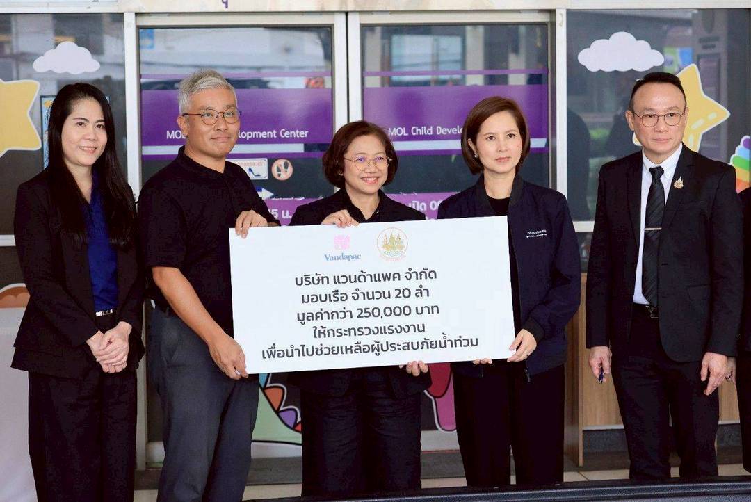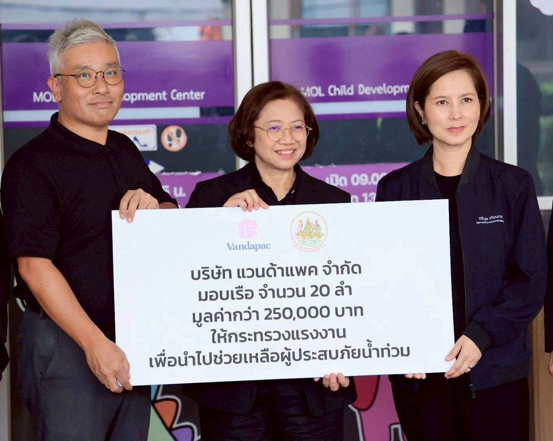 นางสาวตรีนุช เทียนทอง รัฐมนตรีว่าการกระทรวงแรงงาน กล่าวว่า กระทรวงแรงงานขอขอบคุณบริษัท แวนด้าแพค จำกัด ที่ให้ความสำคัญต่อความเดือดร้อนของประชาชน และสนับสนุนภารกิจภาครัฐด้วยการมอบเรือจำนวน 20 ลำแก่กระทรวงแรงงาน ซึ่งจะช่วยเสริมศักยภาพให้หน่วยงานในสังกัดสามารถลงพื้นที่ดูแลและให้ความช่วยเหลือพี่น้องผู้ใช้แรงงานที่ได้รับผลกระทบจากสถานการณ์น้ำท่วมในภาคใต้ได้อย่างทันท่วงทีและทั่วถึง