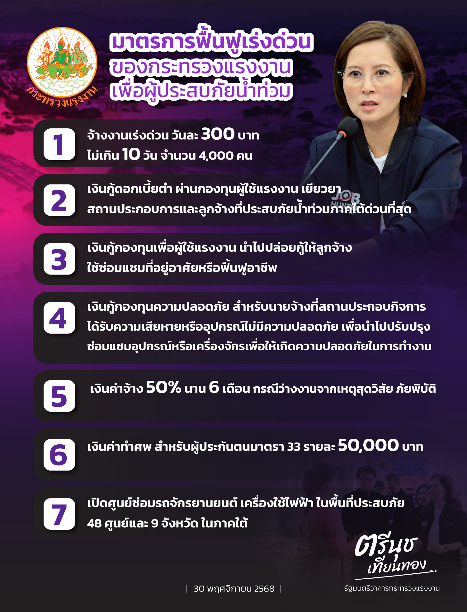 รมว.แรงงาน กล่าวว่า สำหรับมาตรการเร่งด่วนของกระทรวงแรงงานเพื่อช่วยเหลือผู้ประสบภัย มีด้วยกันหลายมาตรการ ทั้งการจ้างงานเร่งด่วน วันละ 300 บาท ไม่เกิน 10 วัน จำนวน 4,000 คน เงินกู้ดอกเบี้ยต่ำ ผ่านกองทุนผู้ใช้แรงงาน เยียวยาสถานประกอบการและลูกจ้างที่ประสบภัยน้ำท่วมภาคใต้ด่วนที่สุด เงินกู้กองทุนเพื่อผู้ใช้แรงงานนำไปปล่อยกู้ให้ลูกจ้างใช้ซ่อมแซมที่อยู่อาศัยหรือฟื้นฟูอาชีพ เงินกู้กองทุนความปลอดภัย สำหรับนายจ้างที่สถานประกอบกิจการได้รับความเสียหายหรืออุปกรณ์ไม่มีความปลอดภัย เพื่อนำไปปรับปรุงซ่อมแซมอุปกรณ์หรือเครื่องจักรเพื่อให้เกิดความปลอดภัยในการทำงาน การจ่ายเงินค่าจ้าง 50% นาน 6 เดือน กรณีว่างงานจากเหตุสุดวิสัย ภัยพิบัติ เงินค่าทำศพ สำหรับผู้ประกันตนมาตรา 33 รายละ 50,000 บาท และการให้บริการศูนย์ซ่อมรถมอร์เตอร์ไซค์ เครื่องใช้ไฟฟ้า เพื่อบรรเทาความเดือดร้อนของประชาชน