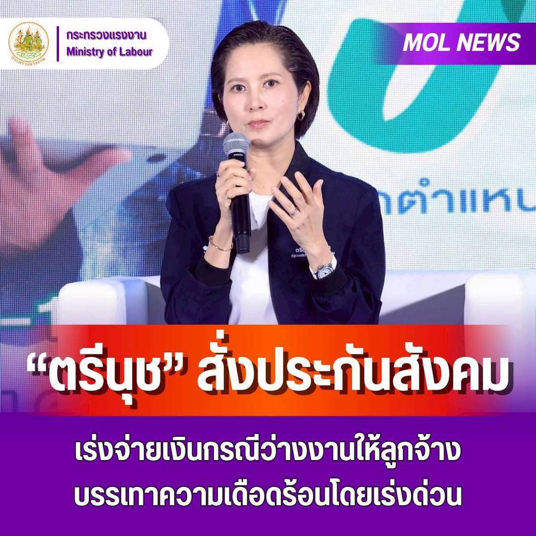 นางสาวตรีนุช เทียนทอง รมว.แรงงาน เปิดเผยถึงกรณีที่มีผู้ประกันตนจำนวนมากร้องเรียนมายังเพจเฟซบุ๊คของรัฐมนตรีว่าการกระทรวงแรงงานและในอีกหลายช่องทาง เรื่องการจ่ายเงินกรณีว่างงานให้แก่ลูกจ้างที่เป็นผู้ประกันตนในระบบประกันสังคมล่าช้าว่า เบื้องต้นได้สั่งการให้เลขาธิการประกันสังคมไปตรวจสอบและเร่งจ่ายเงินกรณีว่างงานให้ลูกจ้างโดยเร่งด่วน เพื่อบรรเทาความเดือดร้อน ทั้งนี้ ได้รับการยืนยันจากเลขาธิการประกันสังคมแล้วว่า จะเริ่มทยอยจ่ายเงินในวันที่ 20 มกราคม 2569 เป็นต้นไป