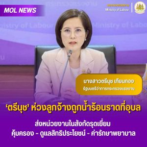 วันที่ 3 ตุลาคม 2568 นางสาวตรีนุช เทียนทอง รัฐมนตรีว่าการกระทรวงแรงงาน เปิดเผยถึง กรณีที่สื่อสังคมออนไลน์เผยแพร่ข่าว ลูกสาวนายจ้างร้านจำหน่ายรถจักรยานยนต์แห่งหนึ่งในจังหวัดอุบลราชธานี ต้มน้ำร้อนราดลูกจ้างสาวบาดเจ็บสาหัสทั้งตัวว่า ตนมีความห่วงใยลูกจ้าง จึงได้สั่งการให้สำนักงานสวัสดิการและคุ้มครองแรงงานจังหวัดอุบลราชธานี ตรวจสอบข้อเท็จจริงทันที โดยในเบื้องต้นพบว่า สถานที่เกิดเหตุเป็นห้างหุ้นส่วนจำกัด สำนักงานตั้งอยู่ที่อำเภอพิบูลมังสาหาร จังหวัดอุบลราชธานี ประกอบกิจการขายจักรยานยนต์ มีลูกจ้าง จำนวน 8 คน โดยลูกจ้างรายดังกล่าวได้ทำงานที่บริษัทแห่งนี้มาประมาณ 3 ปี และคาดว่าสาเหตุน่าจะมาจากเรื่องส่วนตัว อย่างไรก็ดี พี่สาวของลูกจ้างและเพื่อนร่วมงาน ได้นำลูกจ้างรายดังกล่าวส่งโรงพยาบาลพิบูลมังสาหาร แล้ว โดยแพทย์ได้ทำการปฐมพยาบาลเบื้องต้น และนำเข้าห้องผ่าตัด เพื่อลอกผิวหนังที่เสียหายออก ก่อนส่งเข้าไปสังเกตอาการที่ห้องปลอดเชื้อ