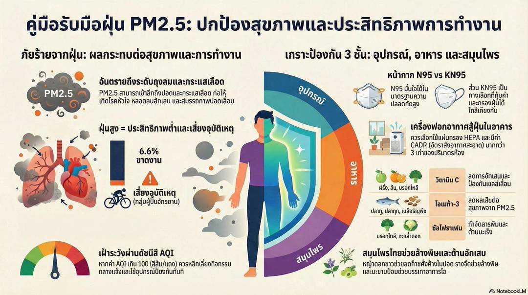 รัฐมนตรีว่าการกระทรวงแรงงาน กล่าวว่า จากค่าฝุ่นที่พุ่งสูงขึ้นอาจทำให้แรงงานเสี่ยงต่อโรคระบบทางเดินหายใจ ดวงตา และผิวหนัง จึงได้มอบหมายให้กรมสวัสดิการและคุ้มครองแรงงาน ออกประกาศขอความร่วมมือนายจ้างและสถานประกอบกิจการ ให้ดำเนินการจัดหาอุปกรณ์ป้องกัน โดยให้นายจ้างจัดหาหน้ากากอนามัยที่สามารถกรองฝุ่น PM 2.5 ได้ (เช่น N95) ให้แก่ลูกจ้างที่ต้องทำงานกลางแจ้ง ปรับแผนการทำงาน: พิจารณาปรับเปลี่ยนเวลาทำงาน หรือลดระยะเวลาการทำงานกลางแจ้งในช่วงที่ค่าฝุ่นอยู่ในระดับวิกฤต (สีแดง) ตรวจสอบสุขภาพของลูกจ้างอย่างสม่ำเสมอโดยเฉพาะแรงงานก่อสร้าง ถือเป็นกลุ่มที่น่าเป็นห่วงมากที่สุด เพราะต้องเผชิญกับฝุ่นสองต่อ ทั้งจากมลพิษในอากาศและฝุ่นจากการทำงาน เช่น การเจาะหรือตัดคอนกรีตและเซรามิก ซึ่งฝุ่นเหล่านี้สามารถเข้าไปสะสมในระบบทางเดินหายใจและถุงลมในปอดได้