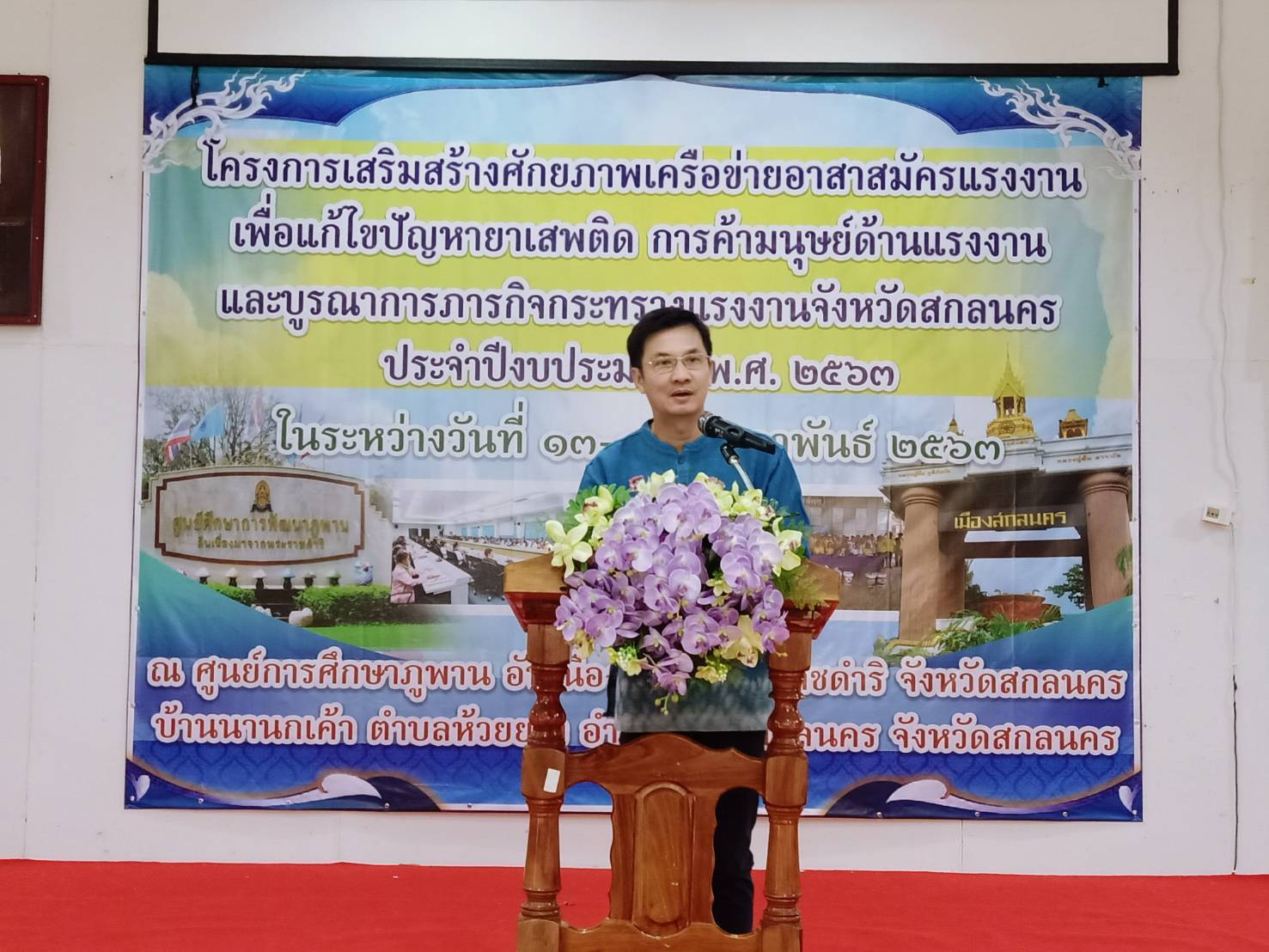 ที่ปรึกษารัฐมนตรีว่าการกระทรวงแรงงาน เปิดโครงการเสริมสร้างศักยภาพเครือข่ายอาสาสมัครแรงงาน เพื่อแก้ไขปัญหายาเสพติด การค้ามนุษย์ด้านแรงงาน และบูรณาการภารกิจกระทรวงแรงงานจังหวัดสกลนคร ประจำปีงบประมาณ พ.ศ. 2563 พัฒนาอาสาสมัครแรงงานทั้งภารกิจด้านแรงงาน การป้องกันปัญหายาเสพติดในสถานประกอบการ และเป็นเครือข่ายเฝ้าระวังการค้ามนุษย์ด้านแรงงาน ปัจจุบันจังหวัดมีอาสาสมัครแรงงานระดับตำบลครบทุกตำบล จำนวน 125 คน ณ ศูนย์ศึกษาการพัฒนาภูพานอันเนื่องมาจากพระราชดำริ จังหวัดสกลนคร