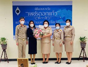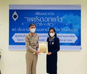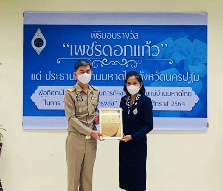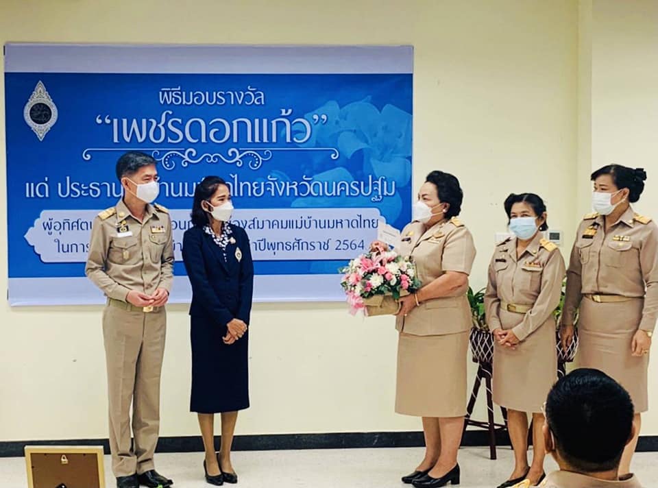 วันที่ 20 กันยายน 2564 เวลา 09.00 น. นางวรรณกานต์ ขาวลาภ แรงงานจังหวัดนครปฐม พร้อมด้วยทีม 5 เสือแรงงานจังหวัดนครปฐม ร่วมเป็นเกียรติในพิธีมอบรางวัลเพชรดอกแก้ว แด่นางวราภรณ์ เจริญศิริโชติ ประธานแม่บ้านมหาดไทยจังหวัดนครปฐม ซึ่งมีผลการดำเนินกิจกรรมของชมรมแม่บ้านมหาดไทยจังหวัดสูงสุดเป็นลำดับที่ 6 โดยมีนายสุรศักดิ์ เจริญศิริโชติ ผู้ว่าราชการจังหวัดนครปฐม เป็นประธานมอบรางวัลเพชรดอกแก้วดังกล่าว ณ ห้องประชุมทับแก้วชั้น 2 ศาลากลางจังหวัดนครปฐม และในโอกาสนี้นางวรรณกานต์ ขาวลาภ แรงงานจังหวัดนครปฐม พร้อมด้วยทีม 5 เสือแรงงานจังหวัดนครปฐม ได้ร่วมมอบกระเช้าดอกไม้ ให้แก่นางวราภรณ์ เจริญศิริโชติ ประธานแม่บ้านมหาดไทยจังหวัดนครปฐม เพื่อแสดงความยินดีอย่างยิ่งเนื่องในโอกาสได้รับรางวัลในครั้งนี้ด้วย