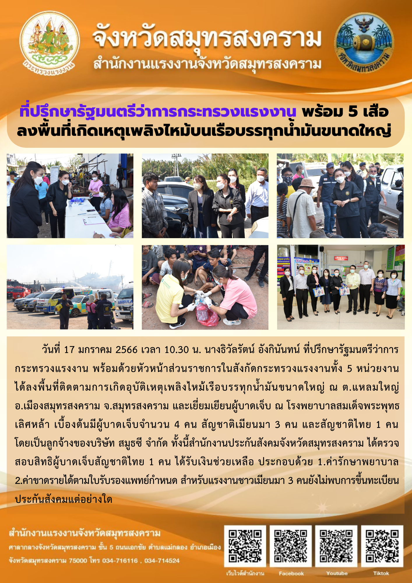 วันที่ 17 มกราคม 2566 เวลา 10.30 น. นางธิวัลรัตน์ อังกินันทน์ ที่ปรึกษารัฐมนตรีว่าการกระทรวงแรงงาน พร้อมด้วยหัวหน้าส่วนราชการในสังกัดกระทรวงแรงงานทั้ง 5 หน่วยงานได้ลงพื้นที่ติดตามการเกิดอุบัติเหตุเพลิงไหม้เรือบรรทุกน้ำมันขนาดใหญ่ ณ ต.แหลมใหญ่อ.เมืองสมุทรสงคราม จ.สมุทรสงคราม และเยี่ยมเยียนผู้บาดเจ็บ ณ โรงพยาบาลสมเด็จพระพุทธเลิศหล้า เบื้องต้นมีผู้บาดเจ็บจำนวน 4 คน สัญชาติเมียนมา 3 คน และสัญชาติไทย 1 คนโดยเป็นลูกจ้างของบริษัท สมูธซี จำกัด ทั้งนี้สำนักงานประกันสังคมจังหวัดสมุทรสงคราม ได้ตรวจสอบสิทธิผู้บาดเจ็บสัญชาติไทย 1 คน ได้รับเงินช่วยเหลือ ประกอบด้วย 1.ค่ารักษาพยาบาล 2.ค่าขาดรายได้ตามใบรับรองแพทย์กำหนด สำหรับแรงงานชาวเมียนมา 3 คนยังไม่พบการขึ้นทะเบียนประกันสังคมแต่อย่างใด
