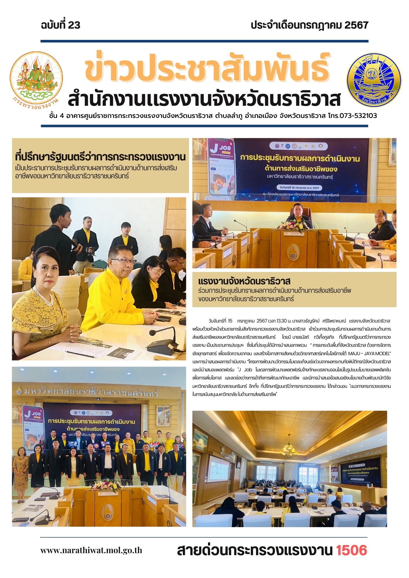 วันจันทร์ที่ 15 กรกฎาคม 2567 เวลา 13.30 น. นางสาวธัญรัศม์ ศรีริพราหมณ์ แรงงานจังหวัดนราธิวาส พร้อมด้วยหัวหน้าส่วนราชการในสังกัดกระทรวงแรงงานจังหวัดนราธิวาส เข้าร่วมการประชุมรับทราบผลการดำเนินงานด้านการส่งเสริมอาชีพของมหาวิทยาลัยนราธิวาสราชนครินทร์ โดยมี นายธนัสถ์ ทวีเกื้อกูลกิจ ที่ปรึกษารัฐมนตรีว่าการกระทรวงแรงงาน เป็นประธานการประชุมฯ ซึ่งในที่ประชุมได้มีการนำเสนอภาพรวม “ การยกระดับพื้นที่จังหวัดนราธิวาส ด้วยการจัดการเชิงยุทธศาสตร์ เพื่อขจัดความยากจน และสร้างโอกาสทางสังคมด้วยวิทยาศาสตร์เทคโนโลยีภายใต้ MAJU – JAYA MODEL” และการนำเสนอผลการดำเนินงาน “โครงการพัฒนานวัตกรรมโมเดลแก้จนเร่งด่วนจากผลกระทบภัยพิบัติกรณีจังหวัดนราธิวาส และมีนำเสนอแพลตฟอร์ม “J Job โมเดลการพัฒนาแพลตฟอร์มจ้างทักษะแรงงานออนไลน์ในรูปแบบโมบายแอพพลิเคชัน เพื่อการเพิ่มโอกาส และลดช่องว่างการเข้าถึงการพัฒนาทักษะอาชีพ และมีการนำเสนอข้อเสนอเชิงนโยบายด้านพัฒนานักวิจัยมหาวิทยาลัยนราธิวาสราชนครินทร์ อีกทั้ง ที่ปรึกษารัฐมนตรีว่าการกระทรวงแรงงาน ได้กล่าวมอบ “แนวทางกระทรวงแรงงาน ในการสนับสนุนมหาวิทยาลัย ในด้านการส่งเสริมอาชีพ”