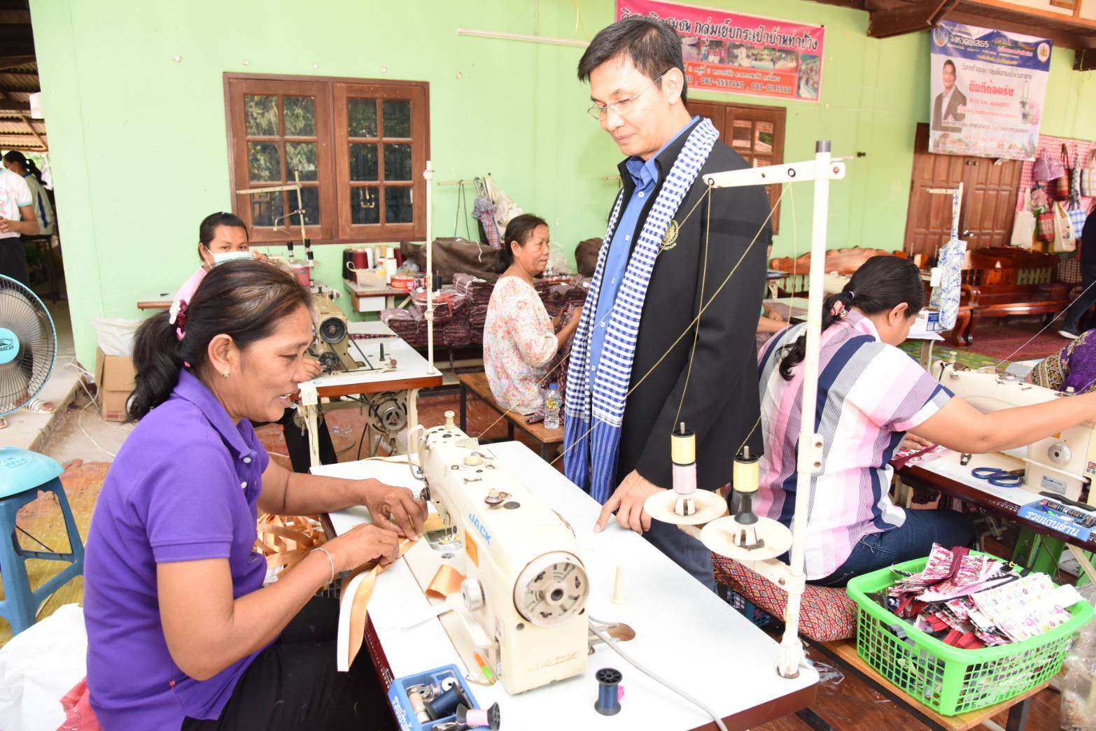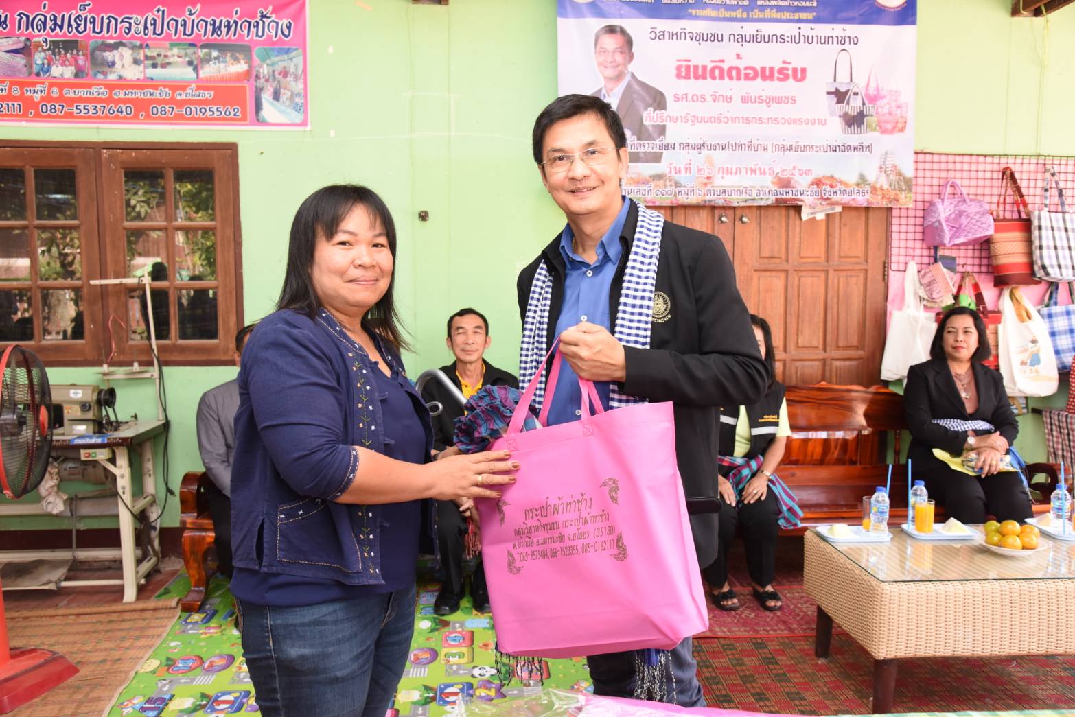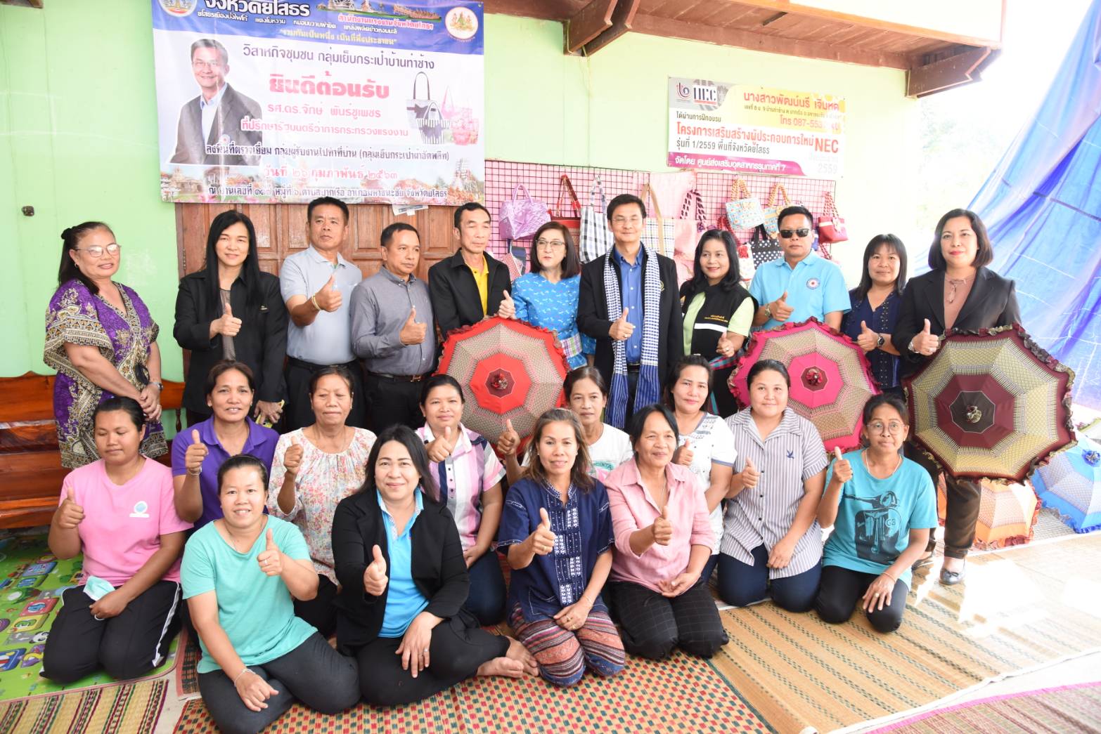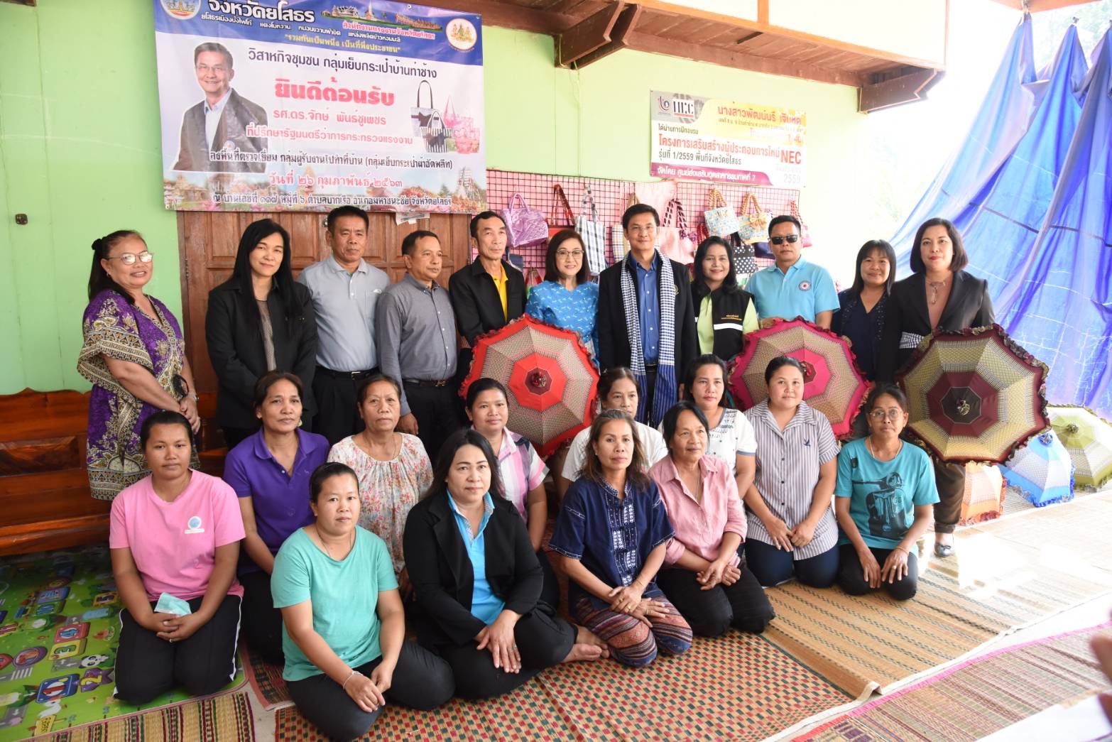 วันที่ ๒๖ กุมภาพันธ์ ๒๕๖๓ เวลา ๑๔.๐๐ น. รองศาสตราจารย์ ดร.จักษ์ พันธ์ชูเพชร ที่ปรึกษารัฐมนตรีว่าการกระทรวงแรงงาน ตรวจเยี่ยมกลุ่มผู้รับงานไปทำบ้าน กลุ่มเย็บกระเป๋าผ้าอัดพลีท มีสมาชิกกลุ่มทั้งหมด จำนวน ๑๒ คน โดยมี นางเจนจิรา เดชะรัฐ จัดหางานจังหวัดยโสธร นำเยี่ยมชมกลุ่มผู้รับงานไปทำบ้าน ซึ่งนางสาวพะเยาว์ เจิมหด เป็นประธานกลุ่ม ณ บ้านเลขที่ ๑๑๗ หมู่ที่ ๖ ตำบลบากเรือ อำเภอมหาชนะชัย จังหวัดยโสธร ซึ่งทางกลุ่มได้ส่งสินค้าไปจำหน่ายที่ บริษัท บิ๊กซีราชดำริ จำกัด ถนนราชดำริ แขวงลุมพินี เขตปทุมวัน จังหวัดกรุงเทพมหานคร ร้านดรุณีกระเป๋าผ้าทอมือ อำเมือง จังหวัดยโสธร และร้านนารายา อินเตอร์เทรด ปากเกร็ด นนทบุรี