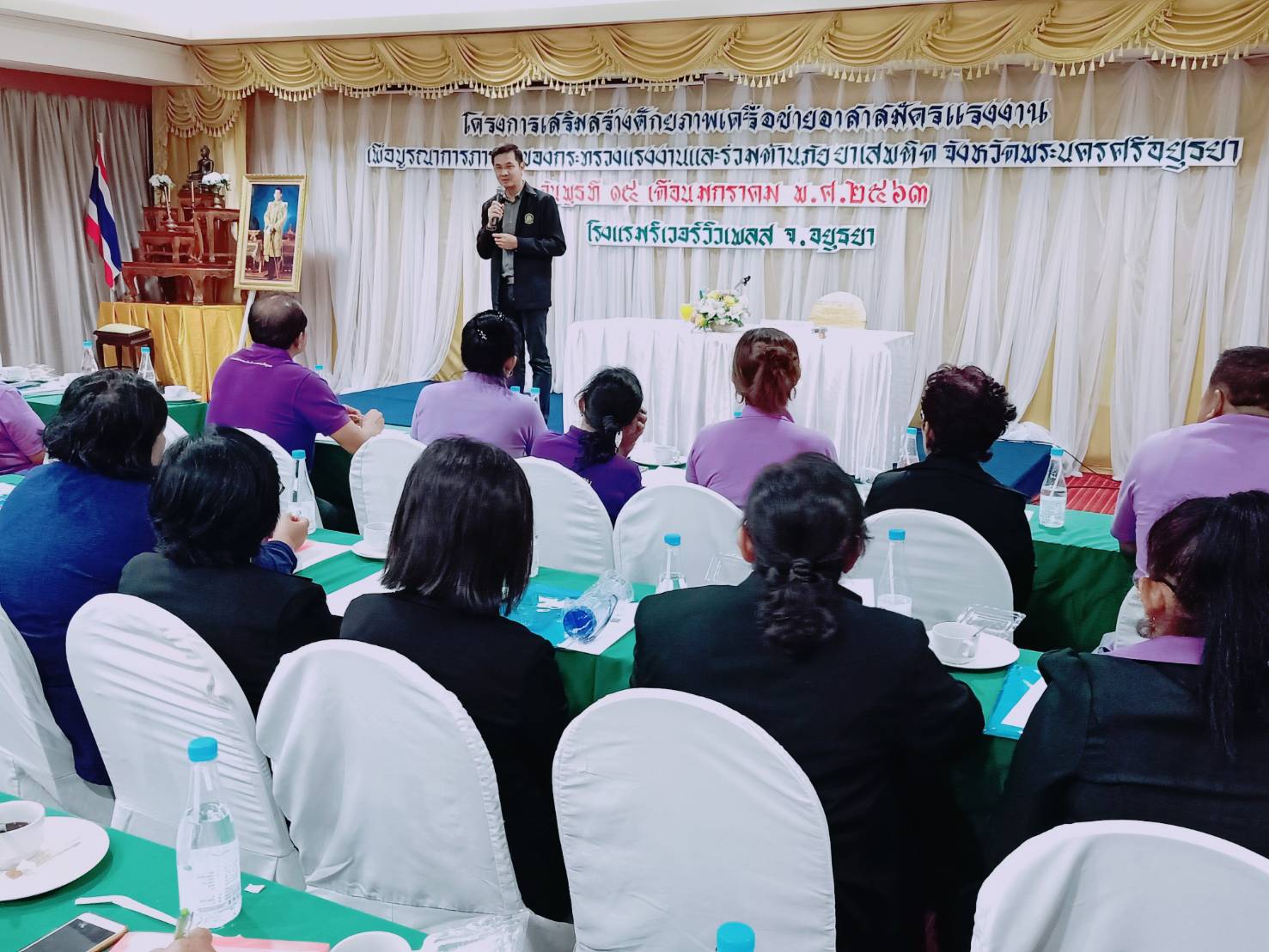 วันนี้ (15 ม.ค. 63) เวลา 09.35 น. รศ.ดร.จักษ์ พันธ์ชูเพชร ที่ปรึกษารัฐมนตรีว่าการกระทรวงแรงงาน มอบนโยบายแนวทางการทำงาน ประจำปีงบประมาณ พ.ศ.2563 แก่หัวหน้าส่วนราชการสังกัดกระทรวงแรงงานจังหวัดพระนครศรีอยุธยา พร้อมเป็นประธานในพิธีเปิดการอบรมโครงการเสริมสร้างศักยภาพเครือข่ายอาสาสมัครแรงงานเพื่อบูรณาการภารกิจของกระทรวงแรงงานและร่วมต้านภัยยาเสพติด จังหวัดพระนครศรีอยุธยา และบรรยายหัวข้อ “อาสาสมัครแรงงาน พลังขับเคลื่อนภารกิจกระทรวงแรงงาน” ณ ห้องเพชรไพลิน ชั้น 2 โรงแรมริเวอร์วิว เพลส จังหวัดพระนครศรีอยุธยา ซึ่งการจัดโครงการครั้งนี้ มีวัตถุประสงค์เพื่อเสริมสร้างองค์ความรู้อันเป็นประโยชน์ให้กับอาสาสมัครแรงงานและเครือข่าย ก่อให้เกิดการบูรณาการการทำงานด้านอาสาสมัครแรงงานระหว่างหน่วยงานในสังกัดกระทรวงแรงงานกับเครือข่ายอาสาสมัครแรงงาน เป็นการแลกเปลี่ยนประสบการณ์ในการปฏิบัติงานด้านอาสาสมัครแรงงาน อันจะส่งผลให้เกิดการพัฒนาแนวทางการปฏิบัติงานที่เป็นทิศทางเดียวกัน และสร้างความเข้าใจแนวทางการปฏิบัติงานด้านการป้องกันและแก้ไขปัญหายาเสพติดในสถานประกอบการ โดยมีผู้เข้าร่วมการอบรม จำนวนทั้งสิ้น 250 คน ประกอบด้วย แกนนำอาสาสมัครแรงงานระดับตำบลและเครือข่าย จำนวน 209 คน แรงงานจังหวัดพระนครศรีอยุธยา หัวหน้าส่วนราชการสังกัดกระทรวงแรงงานจังหวัดพระนครศรีอยุธยา จำนวน 6 คน พี่เลี้ยงอาสาสมัครแรงงานจากหน่วยงานสังกัดกระทรวงแรงงาน จำนวน 6 คน เจ้าหน้าที่หน่วยงานสังกัดกระทรวงแรงงาน จำนวน 29 คน