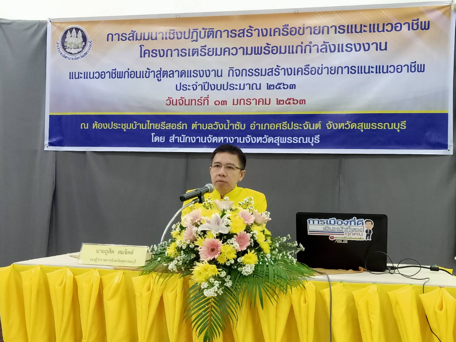 วันนี้ (13 ม.ค. 63) รศ.ดร.จักษ์ พันธ์ชูเพชร ที่ปรึกษารัฐมนตรีว่าการกระทรวงแรงงาน บรรยายหัวข้อ “เปิดประสบการณ์ การเรียน การสอน การเรียนรู้อย่างไรให้ทันเทคโนโลยีเปลี่ยนโลกและมีงานทำที่ยั่งยืน ในอนาคต” ในการสัมมนาเชิงปฏิบัติการสร้างเครือข่ายการแนะแนวอาชีพ ประจำปีงบประมาณ 2563 โดยมี นายภูสิต สมจิตต์ รองผู้ว่าราชการจังหวัดสุพรรณบุรี เป็นประธานในพิธีเปิดการสัมมนาดังกล่าว ณ ห้องประชุมบ้านไทยรีสอร์ท ตำบลวังน้ำซับ อำเภอศรีประจันต์ จังหวัดสุพรรณบุรี ซึ่งการสัมมนาในครั้งนี้จัดขึ้น มีกำหนด 1 วัน ผู้เข้าร่วมสัมมนาประกอบด้วย บุคลากรสถานศึกษาระดับอุดมศึกษาสังกัดสำนักงานเขตพื้นที่การศึกษาประถมศึกษาสุพรรณบุรี เขต 1 เขต 2 เขต 3 โรงเรียนกรรณสูตศึกษาลัยและโรงเรียนสงวนหญิง รวม 71 คน