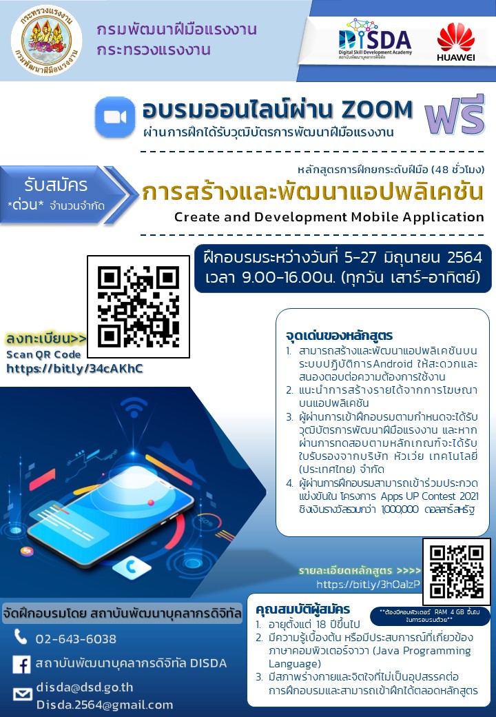 วันที่ 27 พฤษภาคม 2564 ศาสตราจารย์นฤมล ภิญโญสินวัฒน์ รัฐมนตรีช่วยว่าการกระทรวงแรงงาน เปิดเผยว่า กรมพัฒนาฝีมือแรงงาน กระทรวงแรงงาน โดยสถาบันพัฒนาบุคลากรดิจิทัล (DISDA) ร่วมกับบริษัท หัวเว่ย เทคโนโลยี่ (ประเทศไทย) จำกัด มีกำหนดจัดฝึกอบรมหลักสูตร “การสร้างและพัฒนา Application” ผ่านห้องฝึกอบรมออนไลน์ ภายใต้หลักสูตรพัฒนาฝีมือด้านเทคโนโลยีดิจิทัลให้กับกำลังแรงงานให้มีความรู้ ความสามารถ และทักษะที่สูงขึ้น เพื่อให้ทันต่อการเปลี่ยนแปลงของเทคโนโลยี และสอดคล้องกับความต้องการของตลาดแรงงาน สอดรับกับนโยบายของรัฐบาลที่ตระหนักถึงความจำเป็นในการนำเทคโนโลยีดิจิทัลมาเป็นองค์ประกอบสำคัญในการขับเคลื่อนการปฏิรูปประเทศ สู่การเป็นประเทศไทย 4.0 เพื่อสร้างระบบเศรษฐกิจและสังคมของประเทศด้วยนวัตกรรม โดยมีเป้าหมายพัฒนากำลังคนให้มีความพร้อมรองรับการเข้าสู่ยุคดิจิทัลกว่า 4 ล้านคน และจะได้ขยายกลุ่มเป้าหมายไปยังกลุ่มเปราะบางอีกด้วย