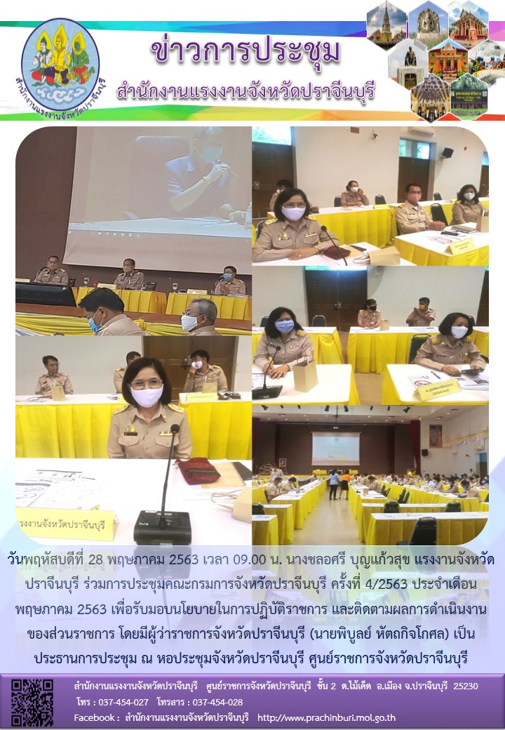วันพฤหัสบดีที่ 28 พฤษภาคม 2563 เวลา 09.00 น. นางชลอศรี บุญแก้วสุข แรงงานจังหวัดปราจีนบุรี ร่วมการประชุมคณะกรมการจังหวัดปราจีนบุรี ครั้งที่ 4/2563 ประจำเดือน พฤษภาคม 2563 เพื่อรับมอบนโยบายในการปฏิบัติราชการ และติดตามผลการดำเนินงานของส่วนราชการ โดยมีผู้ว่าราชการจังหวัดปราจีนบุรี (นายพิบูลย์ หัตถกิจโกศล) เป็นประธานการประชุม ณ หอประชุมจังหวัดปราจีนบุรี ศูนย์ราชการจังหวัดปราจีนบุรี