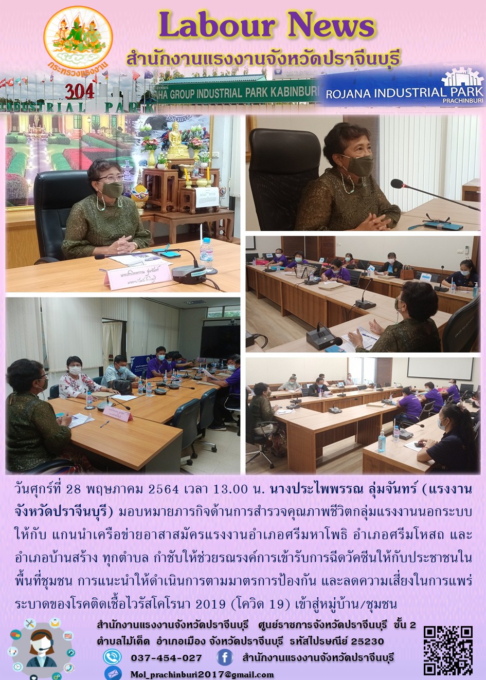 วันศุกร์ที่ 28 พฤษภาคม 2564 เวลา 13.00 น. นางประไพพรรณ ลุ่มจันทร์ (แรงงานจังหวัดปราจีนบุรี) มอบหมายภารกิจด้านการสำรวจคุณภาพชีวิตกลุ่มแรงงานนอกระบบ ให้กับ แกนนำเครือข่ายอาสาสมัครแรงงานอำเภอศรีมหาโพธิ อำเภอศรีมโหสถ และอำเภอบ้านสร้าง ทุกตำบล กำชับให้ช่วยรณรงค์การเข้ารับการฉีดวัคซีนให้กับประชาชนในพื้นที่ชุมชน การแนะนำให้ดำเนินการตามมาตรการป้องกัน และลดความเสี่ยงในการแพร่ระบาดของโรคติดเชื้อไวรัสโคโรนา 2019 (โควิด 19) เข้าสู่หมู่บ้าน/ชุมชน