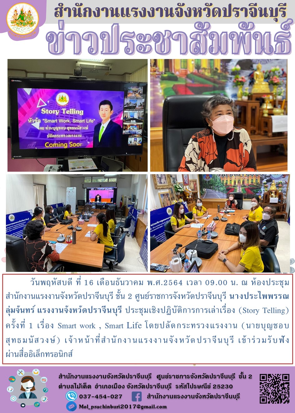 วันพฤหัสบดี ที่ 16 เดือนธันวาคม พ.ศ.2564 เวลา 09.00 น. ณ ห้องประชุมสำนักงานแรงงานจังหวัดปราจีนบุรี ชั้น 2 ศูนย์ราชการจังหวัดปราจีนบุรี นางประไพพรรณ ลุ่มจันทร์ แรงงานจังหวัดปราจีนบุรี ประชุมเชิงปฏิบัติการการเล่าเรื่อง (Story Telling) ครั้งที่ 1 เรื่อง Smart work , Smart Life โดยปลัดกระทรวงแรงงาน (นายบุญชอบ สุทธมนัสวงษ์) เจ้าหน้าที่สำนักงานแรงงานจังหวัดปราจีนบุรี เข้าร่วมรับฟังผ่านสื่ออิเล็กทรอนิกส์