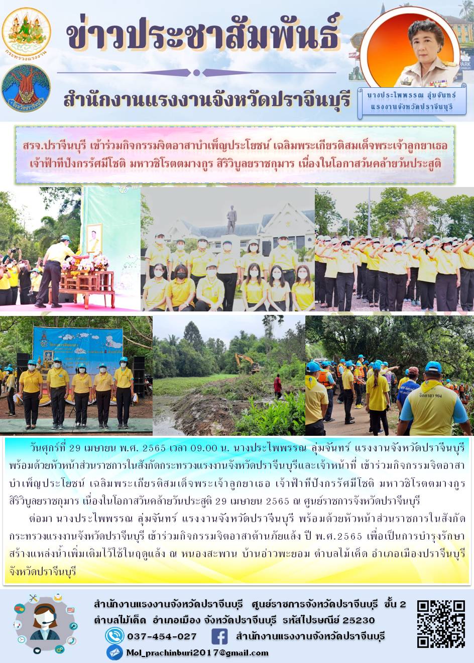 วันศุกร์ที่ 29 เมษายน พ.ศ. 2565 เวลา 09.00 น. นางประไพพรรณ ลุ่มจันทร์ แรงงานจังหวัดปราจีนบุรี พร้อมด้วยหัวหน้าส่วนราชการในสังกัดกระทรวงแรงงานจังหวัดปราจีนบุรีและเจ้าหน้าที่ เข้าร่วมกิจกรรมจิตอาสาบำเพ็ญประโยชน์ เฉลิมพระเกียรติสมเด็จพระเจ้าลูกยาเธอ เจ้าฟ้าทีปังกรรัศมีโชติ มหาวชิโรตตมางกูรสิริวิบูลยราชกุมาร เนื่องในโอกาสวันคล้ายวันประสูติ 29 เมษายน 2565 ณ ศูนย์ราชการจังหวัดปราจีนบุรี ต่อมา นางประไพพรรณ ลุ่มจันทร์ แรงงานจังหวัดปราจีนบุรี พร้อมด้วยหัวหน้าส่วนราชการในสังกัดกระทรวงแรงงานจังหวัดปราจีนบุรี เข้าร่วมกิจกรรมจิตอาสาต้านภัยแล้ง ปี พ.ศ.2565 เพื่อเป็นการบำรุงรักษา สร้างแหล่งน้ำเพิ่มเติมไว้ใช้ในฤดูแล้ง ณ หนองสะพาน บ้านอ่าวพะยอม ตำบลไม้เค็ด อำเภอเมืองปราจีนบุรี จังหวัดปราจีนบุรี
