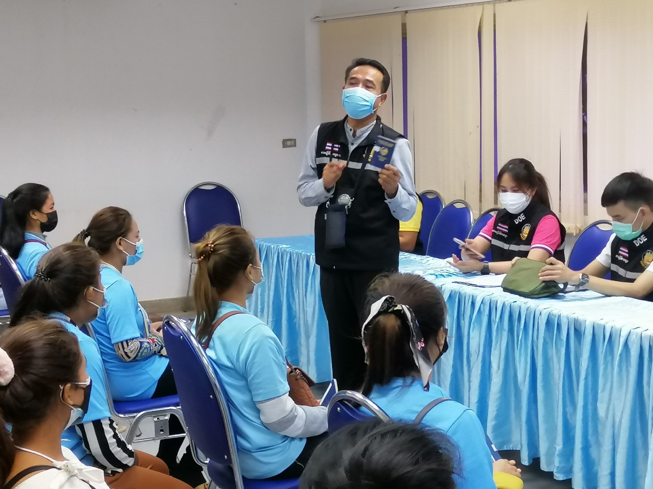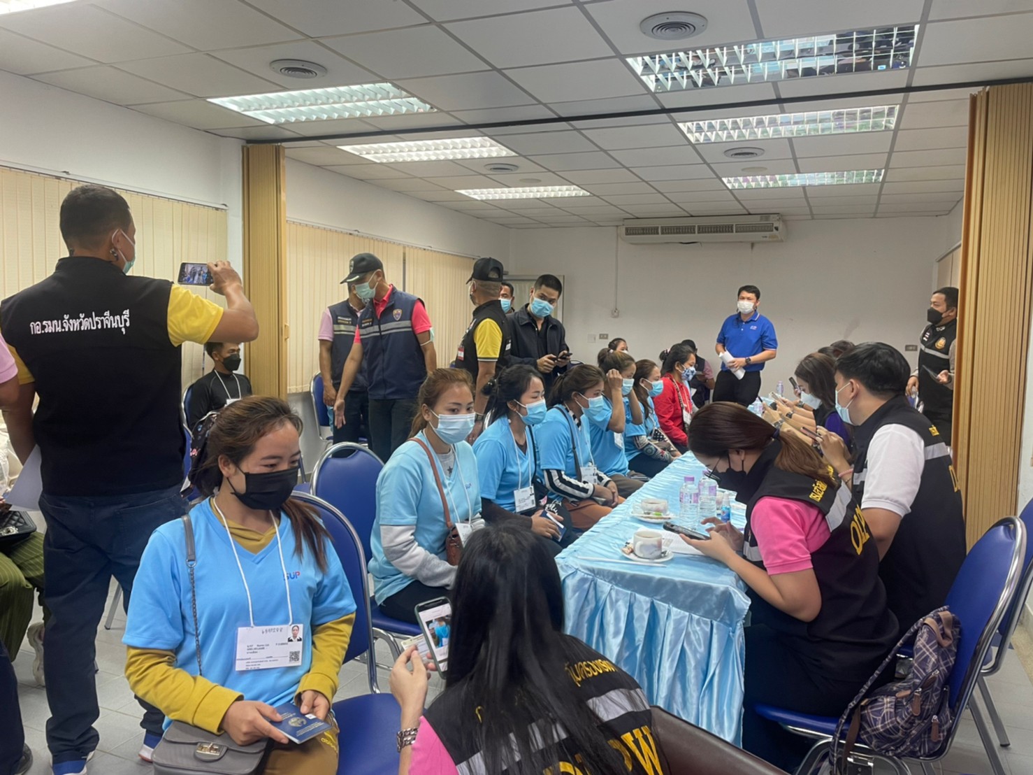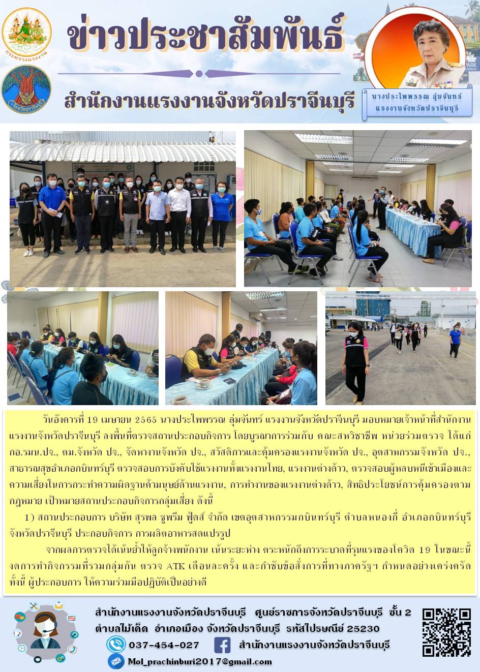 วันอังคารที่ 19 เมษายน 2565 นางประไพพรรณ ลุ่มจันทร์ แรงงานจังหวัดปราจีนบุรี มอบหมายเจ้าหน้าที่สำนักงานแรงงานจังหวัดปราจีนบุรี ลงพื้นที่ตรวจสถานประกอบกิจการ โดยบูรณาการร่วมกับ คณะสหวิชาชีพ หน่วยร่วมตรวจ ได้แก่ กอ.รมน.ปจ., ตม.จังหวัด ปจ., จัดหางานจังหวัด ปจ., สวัสดิการและคุ้มครองแรงงานจังหวัด ปจ., อุตสาหกรรมจังหวัด ปจ., สาธารณสุขอำเภอกบินทร์บุรี ตรวจสอบการบังคับใช้แรงงานทั้งแรงงานไทย, แรงงานต่างด้าว, ตรวจสอบผู้หลบหนีเข้าเมืองและความเสี่ยงในการกระทำความผิดฐานค้ามนุษย์ด้านแรงงาน, การทำงานของแรงงานต่างด้าว, สิทธิประโยชน์การคุ้มครองตามกฎหมาย เป้าหมายสถานประกอบกิจการกลุ่มเสี่ยง ดังนี้