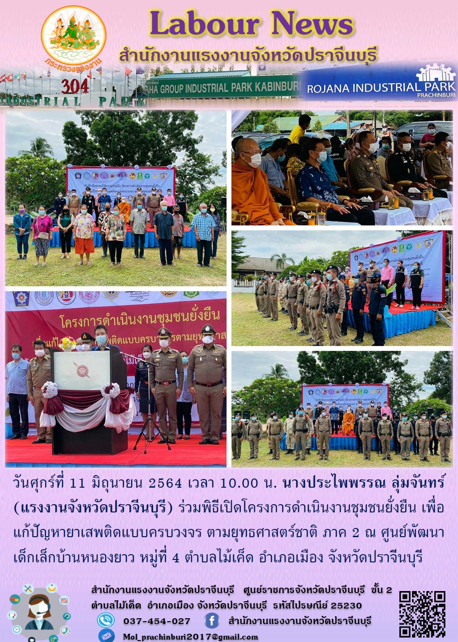 วันศุกร์ที่ 11 มิถุนายน 2564 เวลา 10.00 น. นางประไพพรรณ ลุ่มจันทร์ (แรงงานจังหวัดปราจีนบุรี) ร่วมพิธีเปิดโครงการดำเนินงานชุมชนยั่งยืน เพื่อแก้ปัญหายาเสพติดแบบครบวงจร ตามยุทธศาสตร์ชาติ ภาค 2 ณ ศูนย์พัฒนาเด็กเล็กบ้านหนองยาว หมู่ที่ 4 ตำบลไม้เค็ด อำเภอเมือง จังหวัดปราจีนบุรี