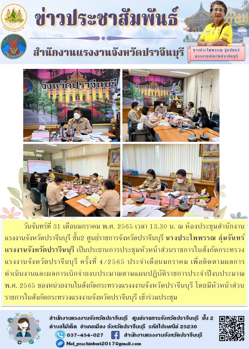 วันจันทร์ที่ 31 เดือนมกราคม พ.ศ. 2565 เวลา 13.30 น. ณ ห้องประชุมสำนักงานแรงงานจังหวัดปราจีนบุรี ชั้น2 ศูนย์ราชการจังหวัดปราจีนบุรี นางประไพพรรณ ลุ่มจันทร์ แรงงานจังหวัดปราจีนบุรี เป็นประธานการประชุมหัวหน้าส่วนราชการในสังกัดกระทรวงแรงงานจังหวัดปราจีนบุรี ครั้งที่ 4/2565 ประจำเดือนมกราคม เพื่อติดตามผลการดำเนินงานและผลการเบิกจ่ายงบประมาณตามแผนปฏิบัติราชการประจำปีงบประมาณ พ.ศ. 2565 ของหน่วยงานในสังกัดกระทรวงแรงงงานจังหวัดปราจีนบุรี โดยมีหัวหน้าส่วนราชการในสังกัดกระทรวงแรงงานจังหวัดปราจีนบุรี เข้าร่วมประชุม