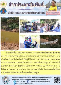 วันอาทิตย์ที่ 23 เดือนมกราคม พ.ศ. 2565 นางประไพพรรณ ลุ่มจันทร์ แรงงานจังหวัดปราจีนบุรี มอบหมายเจ้าหน้าที่ ปิดโครงการแก้ไขปัญหาความเดือดร้อนด้านอาชีพจังหวัดปราจีนบุรี ปี 2565 (งวดที่ 2) กิจกรรมจ้างงานเร่งด่วน สร้าง/ซ่อมแซมฝายชะลอน้ำ สถานที่ : คลองชันบ้านบุสูง ม.10 ต.นาดี อ.นาดี จ.ปราจีนบุรี มีผู้เข้าร่วมโครงการฯ จำนวน 20 คน ทำงาน 3 วัน ได้รับค่าตอบแทนการทำงานวันละ 300 บาทต่อคนต่อวัน ประสานงานพื้นที่โดย อาสาสมัครแรงงานตำบลนาดี นายพงศ์พล เดชสุภา