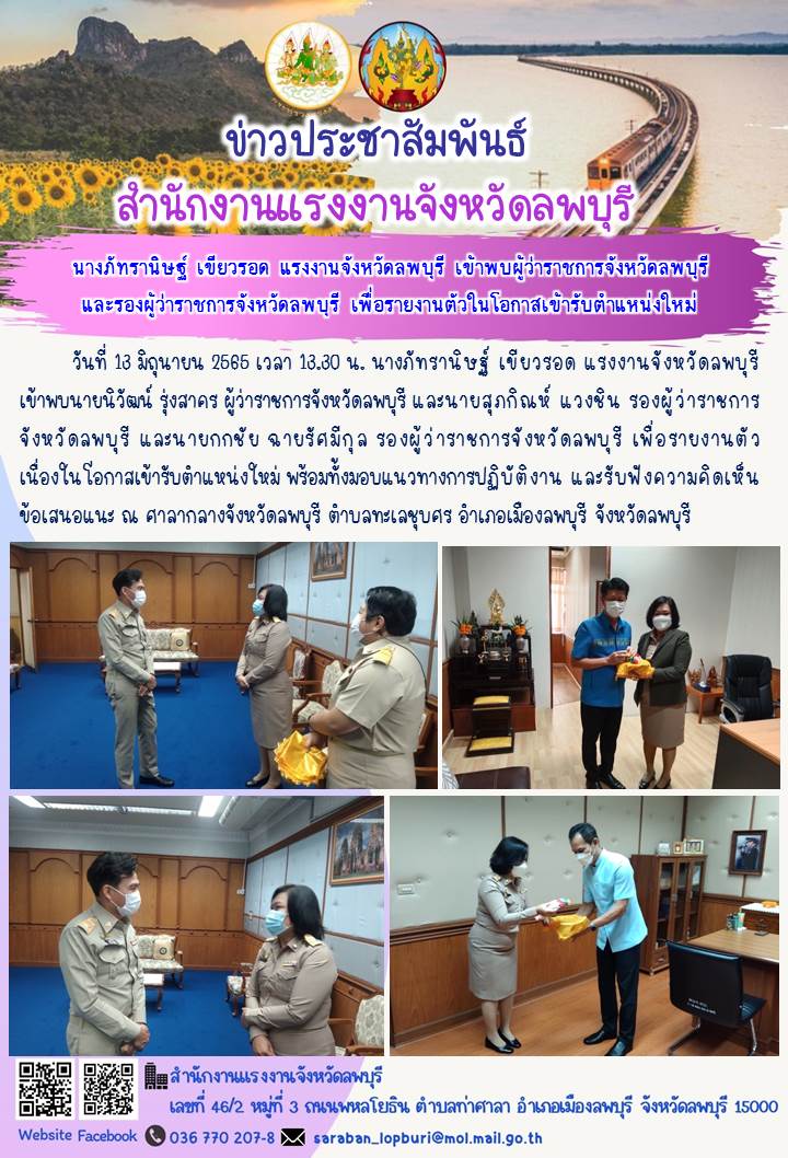 วันที่ 13 มิถุนายน 2565 เวลา 13.30 น. นางภัทรานิษฐ์ เขียวรอด แรงงานจังหวัดลพบุรี เข้าพบนายนิวัฒน์ รุ่งสาคร ผู้ว่าราชการจังหวัดลพบุรี และนายสุภกิณห์ แวงชิน รองผู้ว่าราชการจังหวัดลพบุรี และนายกกชัย ฉายรัศมีกุล รองผู้ว่าราชการจังหวัดลพบุรี เพื่อรายงานตัว เนื่องในโอกาสเข้ารับตำแหน่งใหม่ พร้อมทั้งมอบแนวทางการปฏิบัติงาน และรับฟังความคิดเห็นข้อเสนอแนะ ณ ศาลากลางจังหวัดลพบุรี ตำบลทะเลชุบศร อำเภอเมืองลพบุรี จังหวัดลพบุรี