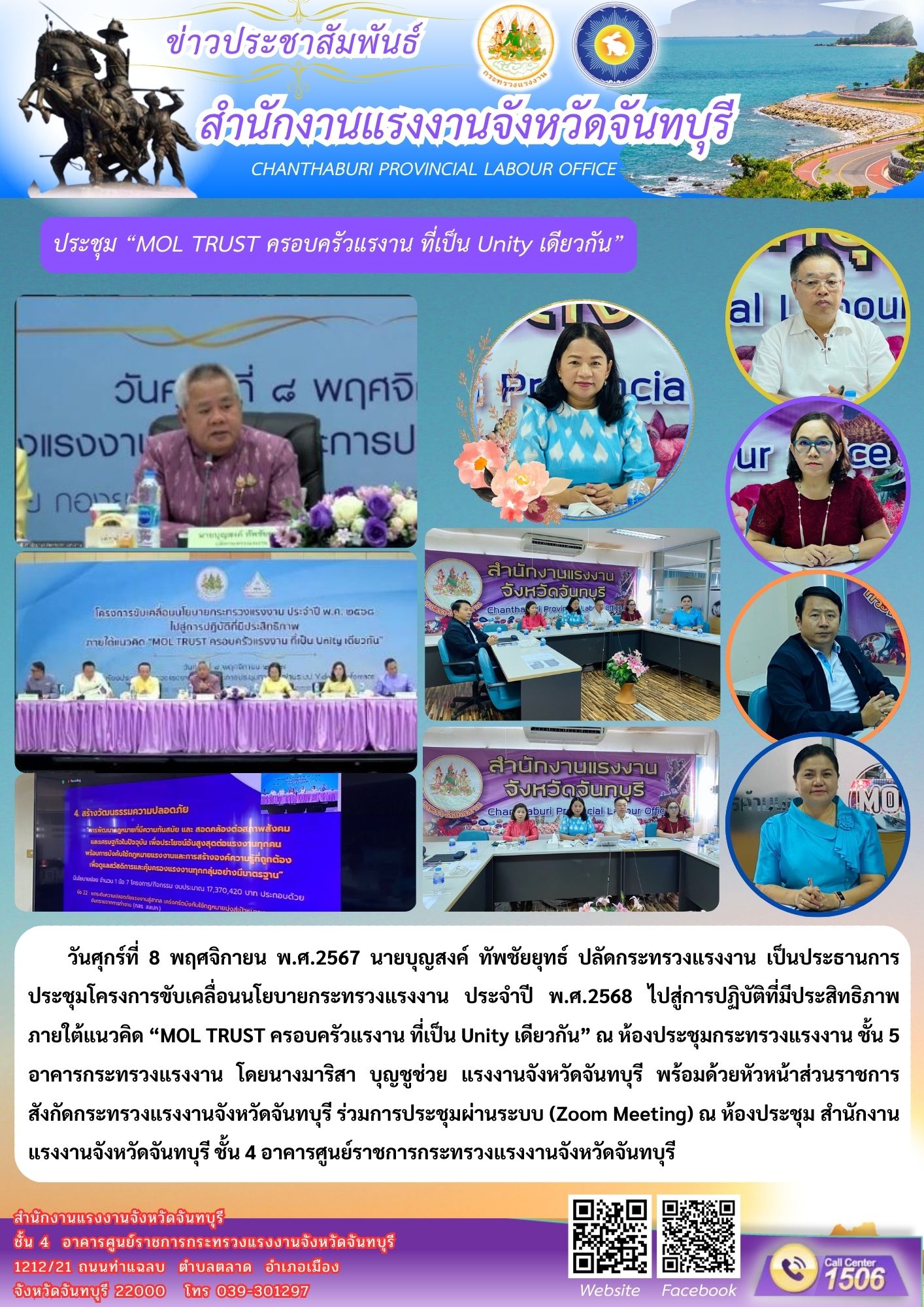 นางมาริสา บุญชูช่วย แรงงานจังหวัดจันทบุรี พร้อมด้วยหัวหน้าส่วนราชการสังกัดกระทรวงแรงงานจังหวัดจันทบุรี ร่วมการประชุมโครงการขับเคลื่อนนโยบายกระทรวงแรงงาน ไปสู่การปฏิบัติที่มีประสิทธิภาพ ภายใต้แนวคิด “MOL TRUST ครอบครัวแรงาน ที่เป็น Unity เดียวกัน”